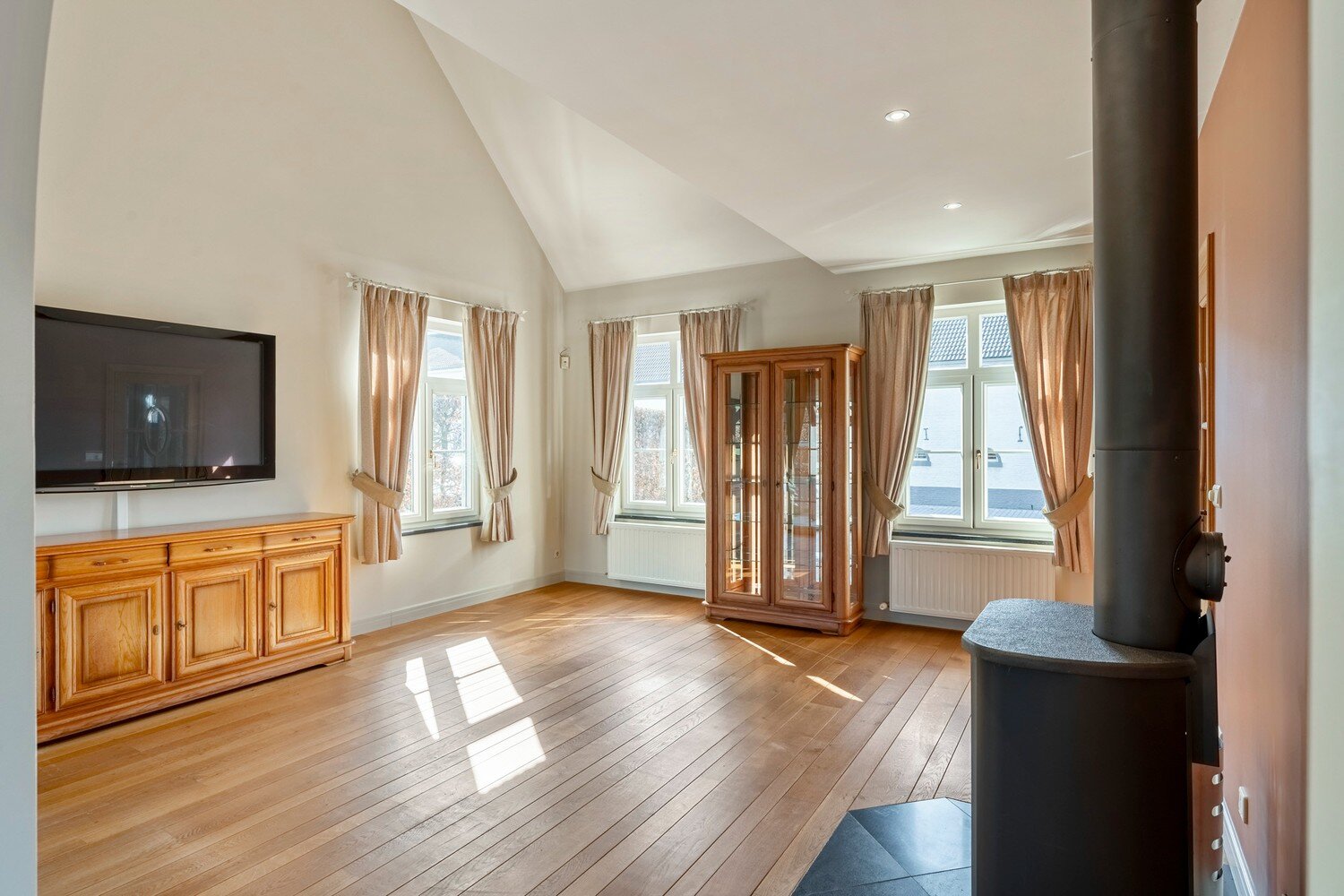 De woonkamer straalt warmte en gezelligheid uit, met (2 cm dik) eiken parket en een Hoog Rendement kachel van Flam. Grote ramen zorgen voor een overvloed aan natuurlijk licht en bieden toegang tot het overdekte terras, waar u in alle privacy kunt genieten van de tuin.