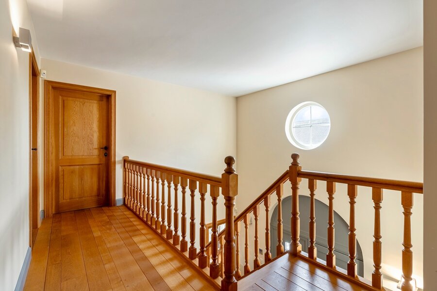 Bij binnenkomst zet deze eerste indruk zich moeiteloos verder. De hal verwelkomt u met een luxueuze blauwe stenen vloer en een majestueuze eiken trap. De elegante boogvormige doorgangen geven een harmonieus karakter aan de woning.