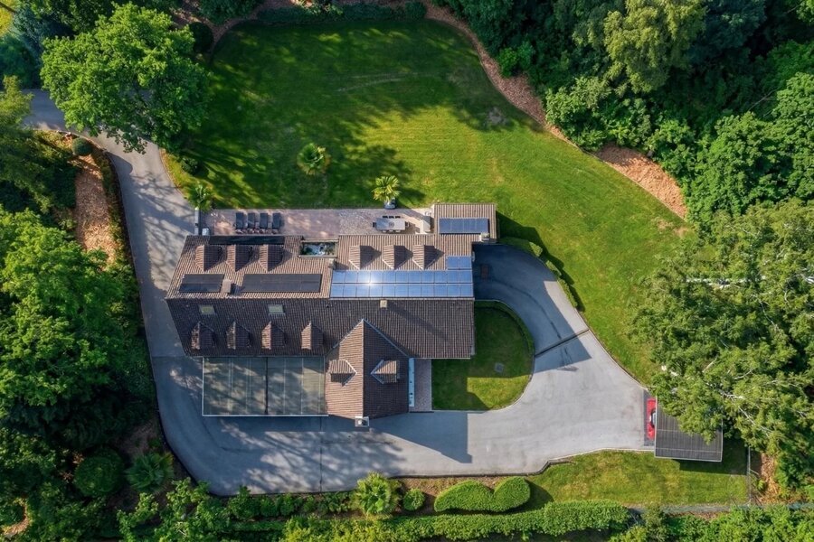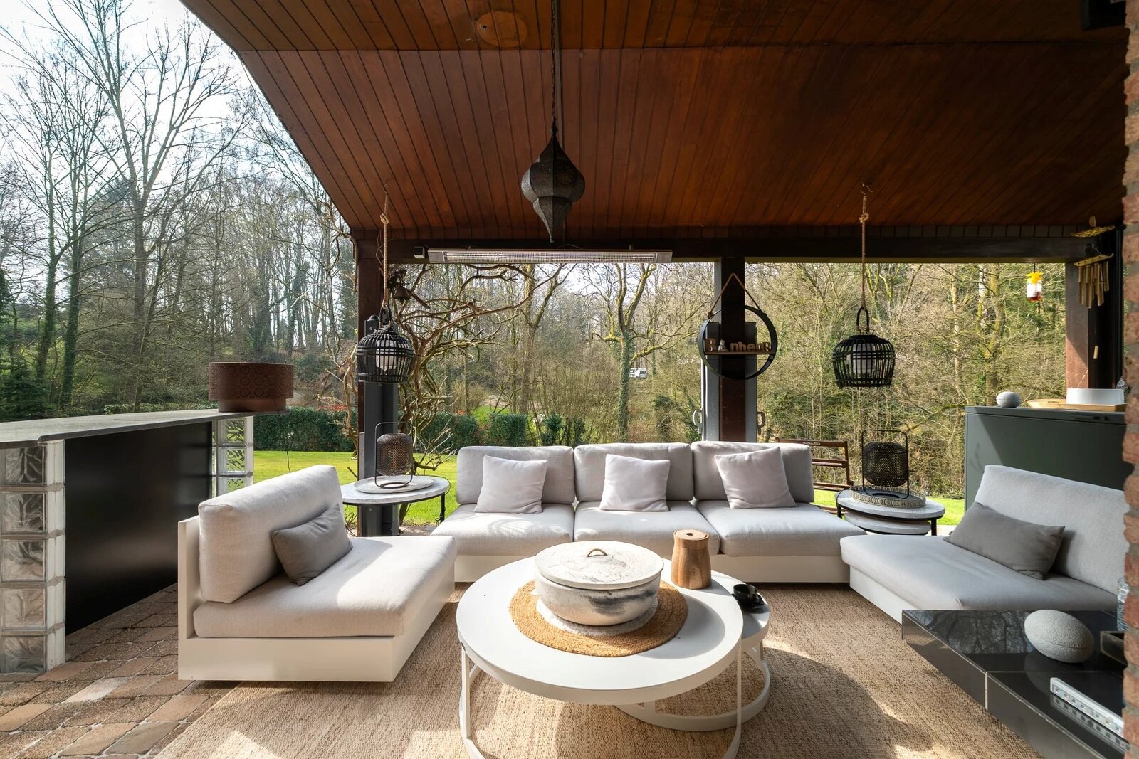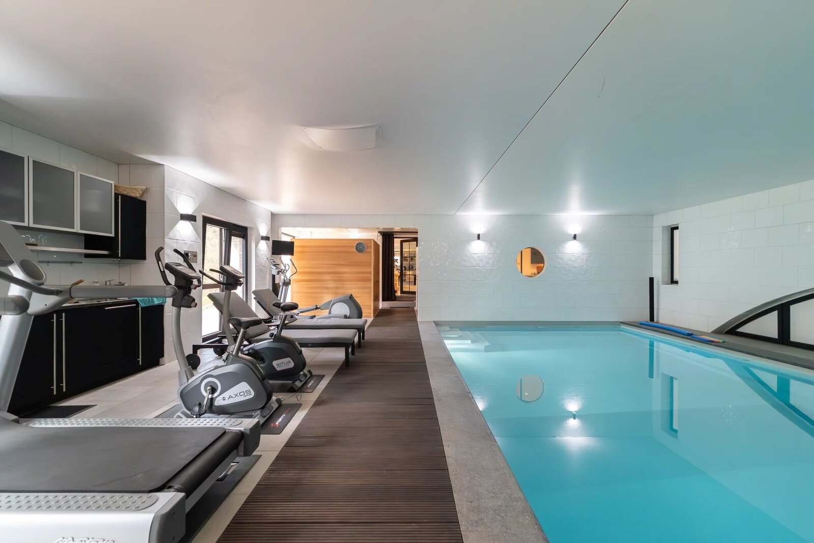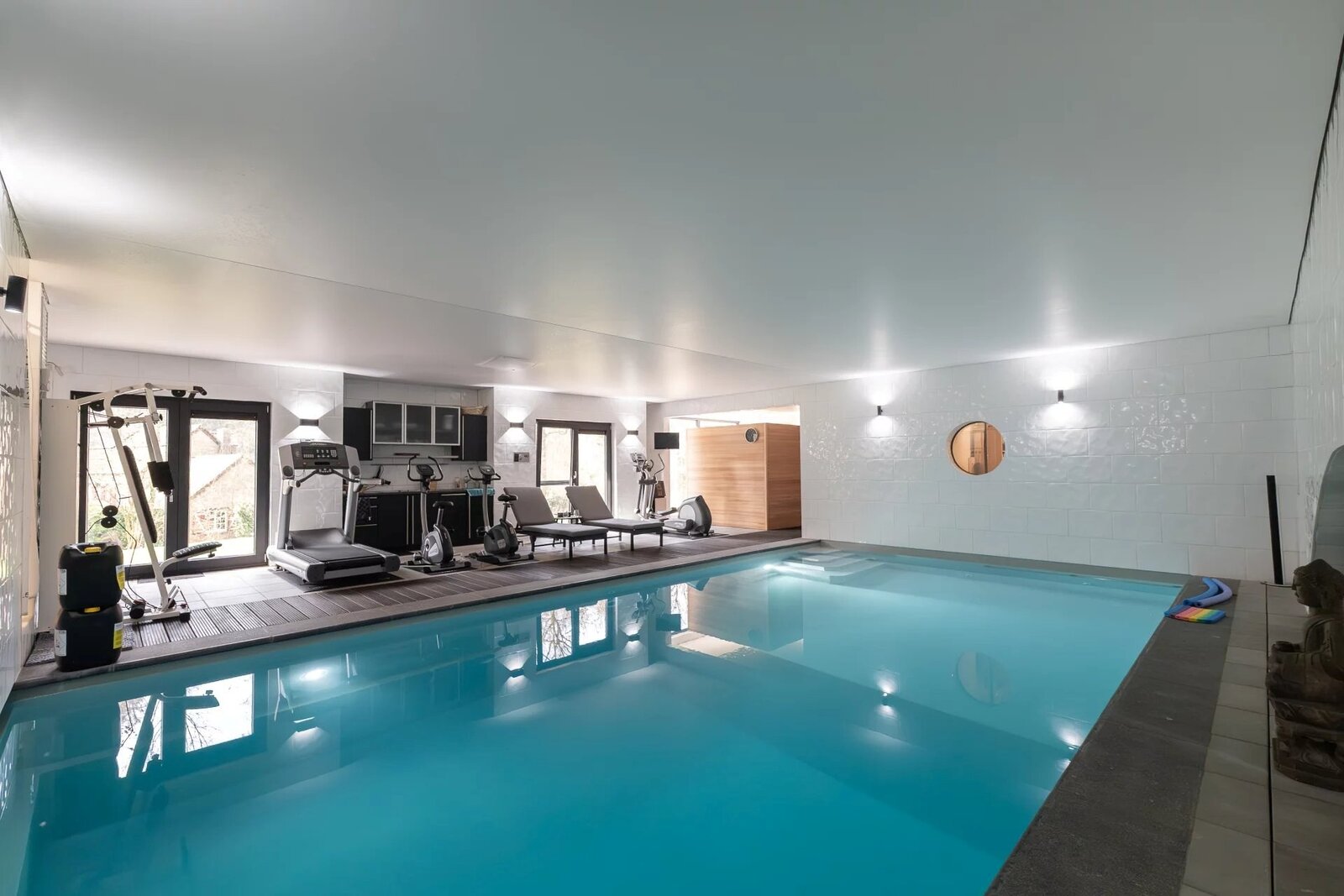 L’espace bien-être comprend piscine chauffée (11 x 5,5 m), sauna, salle de sport équipée et cuisine d’été. Terrasse plein sud de ± 106 m² avec salon couvert, bar et barbecue.