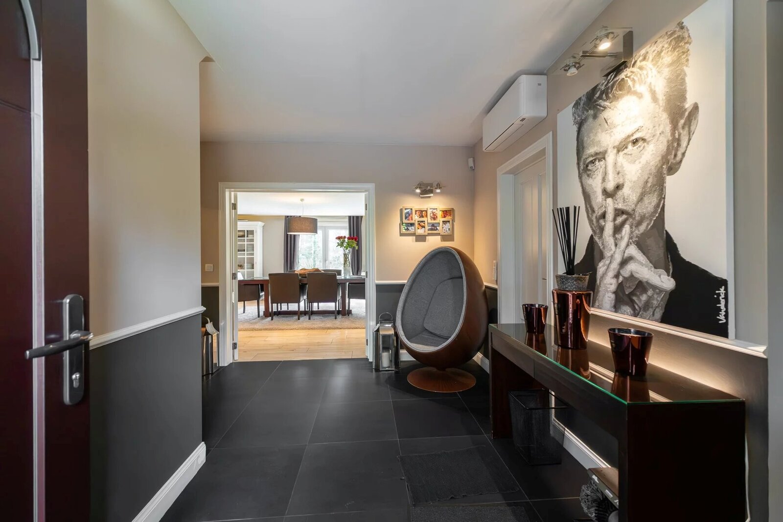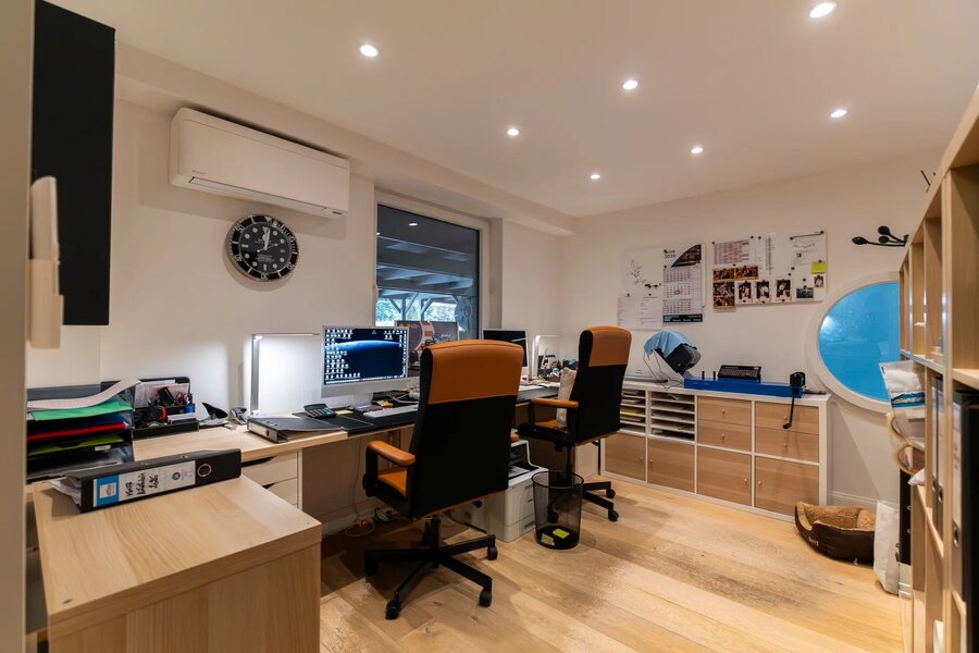 Le hall d’entrée s’ouvre sur un séjour de ± 90 m² prolongé par une cuisine ouverte entièrement équipée. Deux salons distincts complètent le rez-de-chaussée : un salon d’été et un salon d’hiver avec cheminée, actuellement aménagé en bureau. À l’étage, trois chambres lumineuses se partagent une salle de bains ; la suite parentale dispose d’un dressing et d’une salle d’eau. Toutes les pièces bénéficient d’une climatisation réversible.
