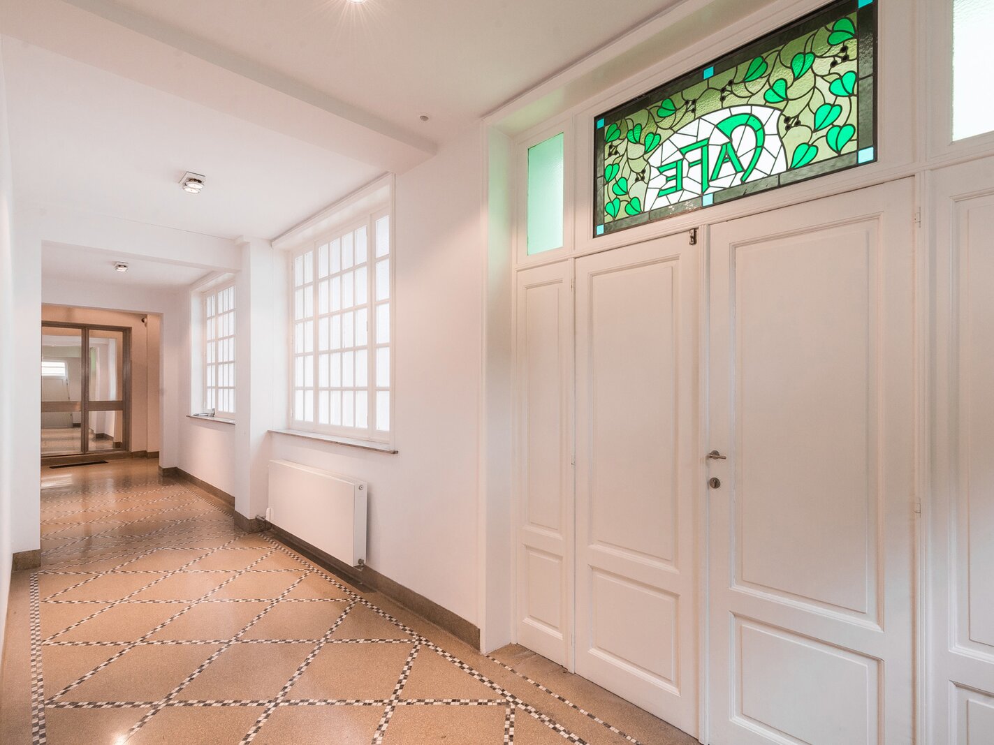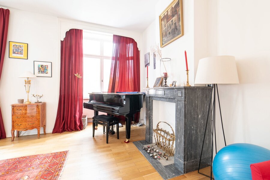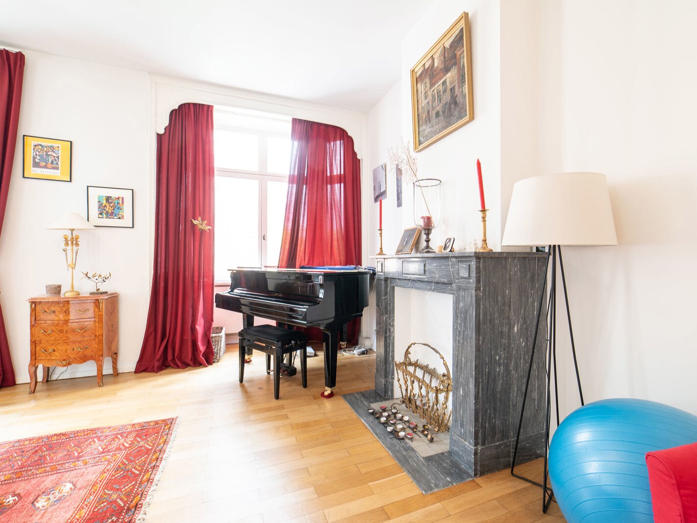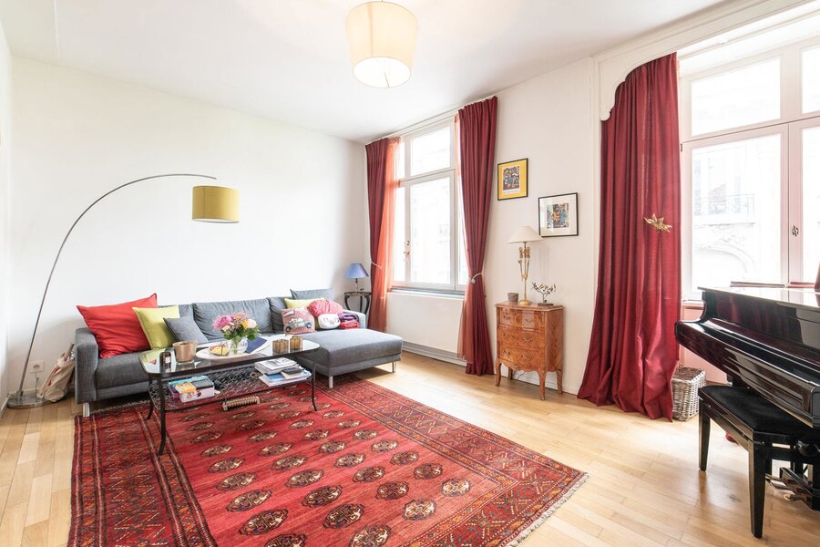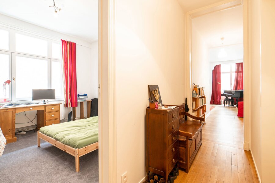 Sis dans un immeuble de caractère qui a fait l'objet d'une rénovation complète, bel appartement deux chambres et deux salles d'eau de 113 m2 (mesures PEB) offrant énormément de lumière. On y retrouve de beaux matériaux (parquet au sol), une cuisine super-équipée ainsi que deux belles chambres avec chacune leur salle d'eau.
