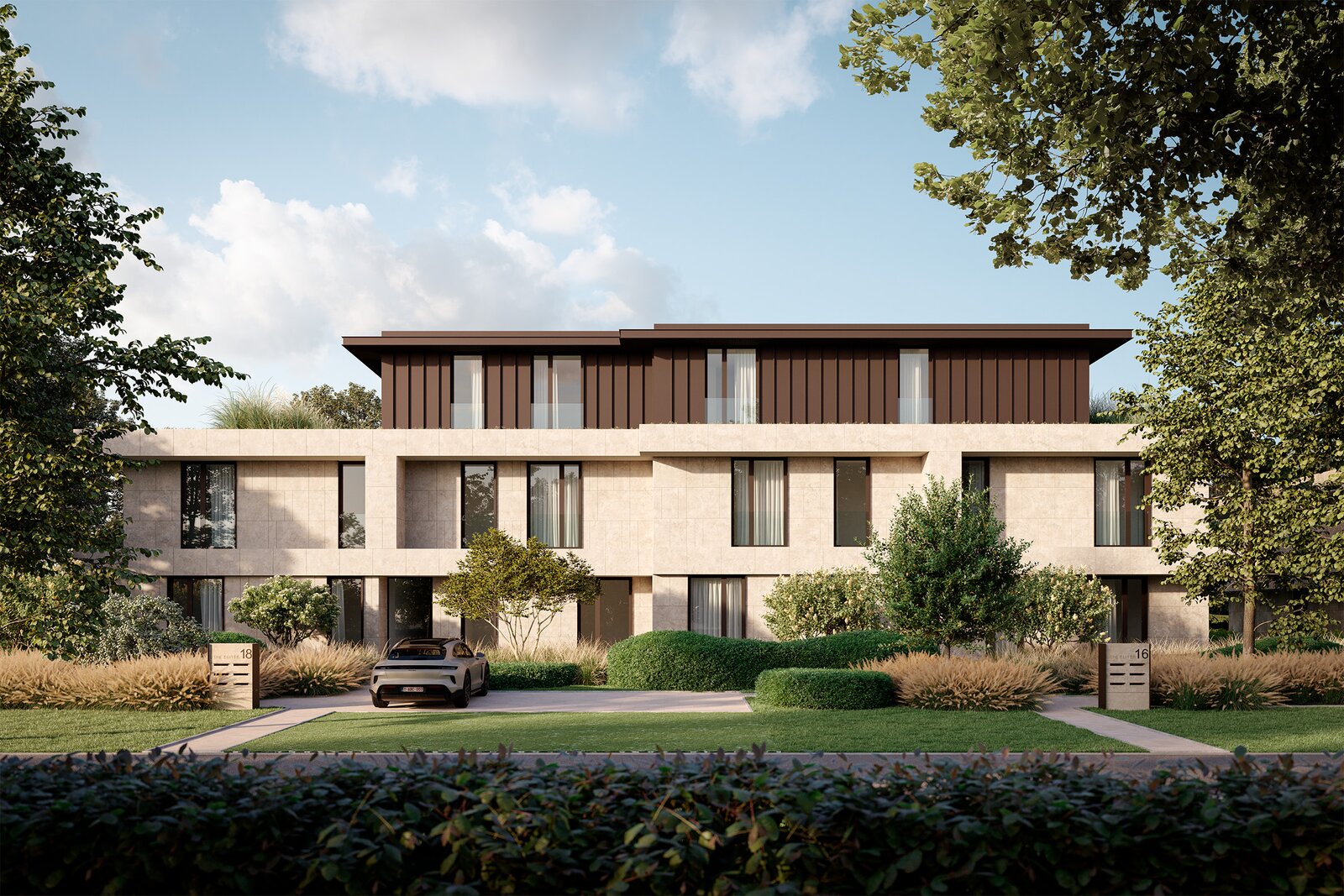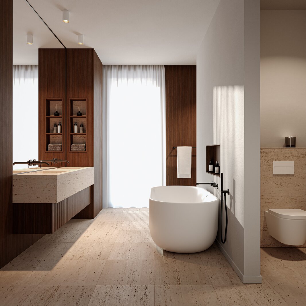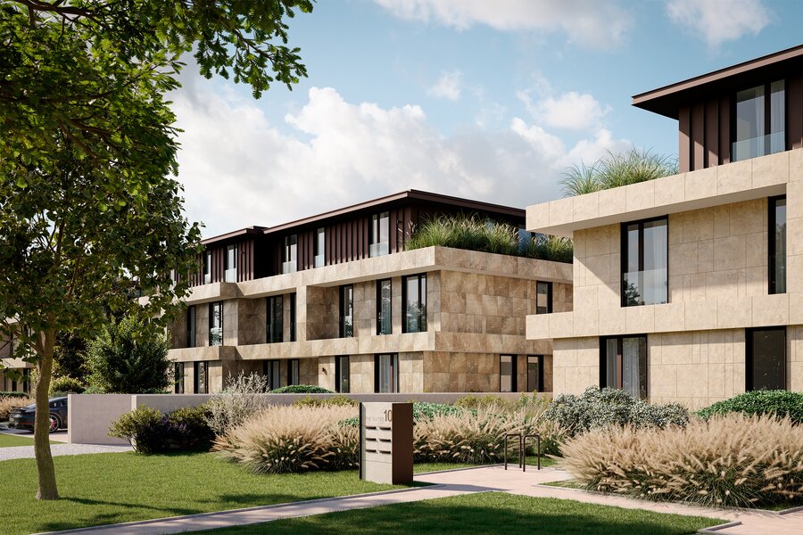 Duurzaam wonen staat centraal in "The Suites", met voorzieningen zoals zonnepanelen, regenwaterrecuperatie, een warmtepomp en pre-installaties voor laadpalen. Het project zal een E-peil van E10 of lager behalen. Voor de afwerking zijn ruime budgetten voorzien, zodat elk appartement volledig naar eigen smaak kan worden ingericht samen met onze klantenbegeleiders. Het ontwerp is in handen van internationaal gerenommeerd architect Dieter Vander Velpen, die voor een tijdloze en verfijnde uitstraling heeft gezorgd.