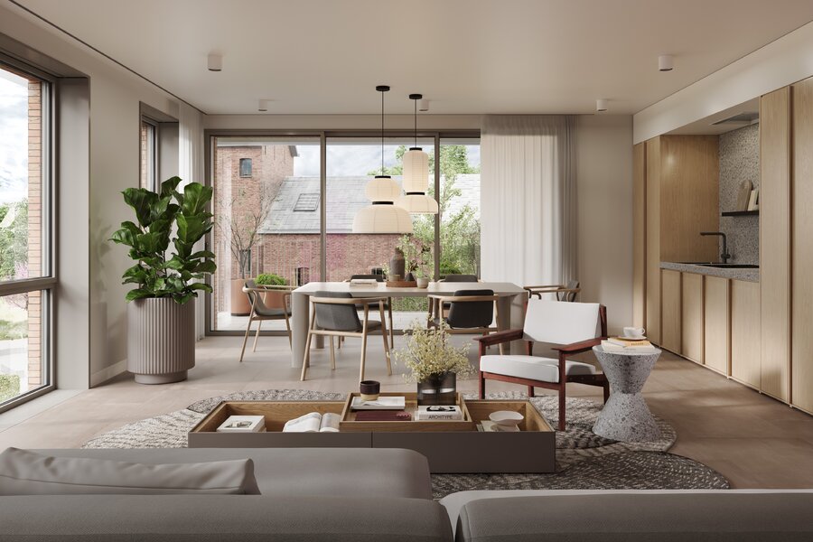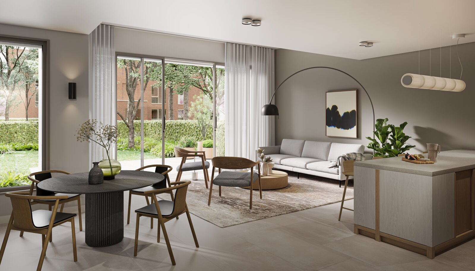 De ruime inkomhal, uitgerust met een vestiaire en een gastentoilet, leidt naar de zeer lichtrijke leefruimte met open keuken. Via grote schuiframen krijgt u toegang tot de twee royale terrassen van in totaal 55 m². Door gebruik te maken van grote schuiframen en raampartijen wordt de leefruimte voorzien van veel natuurlijk lichtinval.