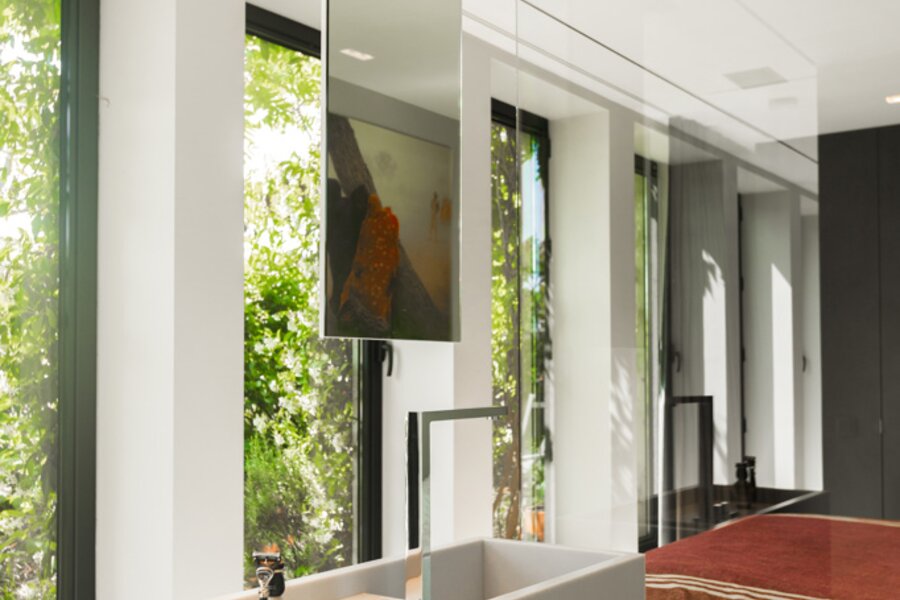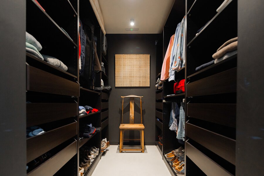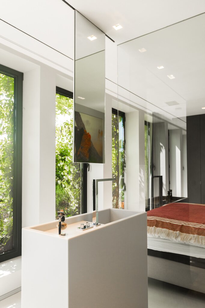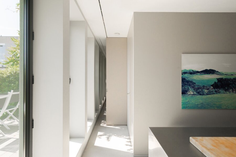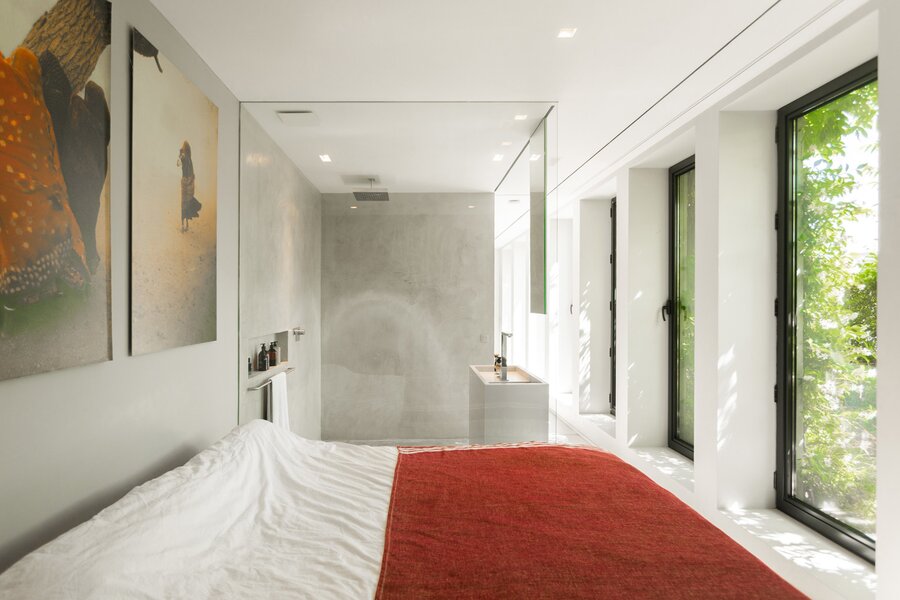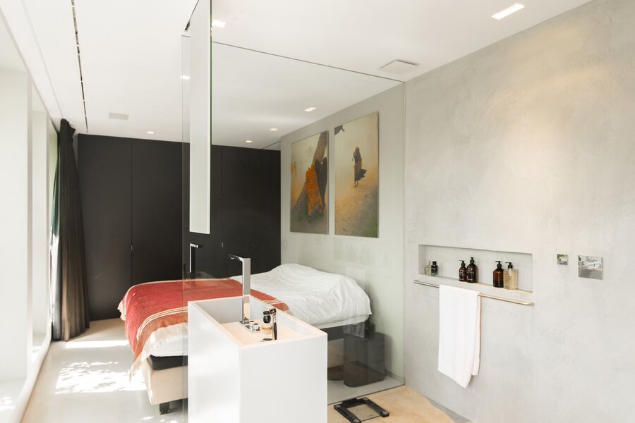 De l'autre côté du hall d'entrée : dressing élégant et chambre à coucher avec salle de bains design ouverte, qui se prolonge à nouveau par la cuisine. Les nombreuses fenêtres et les plantes de la terrasse apportent à la fois lumière et intimité. Toutes les pièces peuvent être fermées par des portes coulissantes. La terrasse s'étend également sur toute la longueur, pour les journaux et le café au soleil du matin.