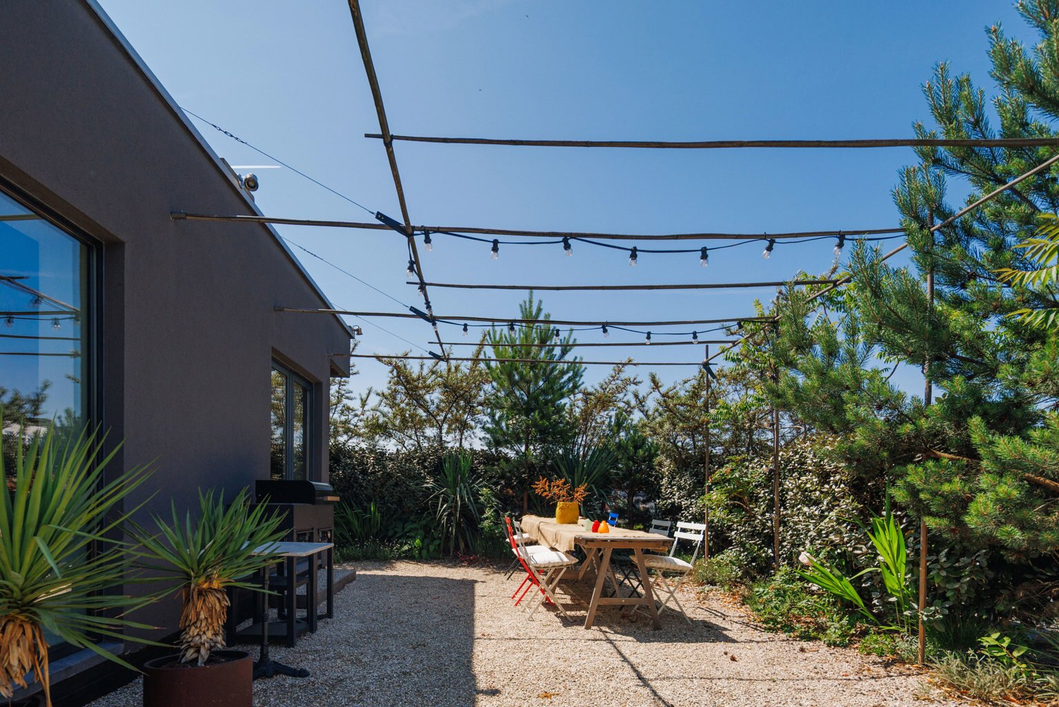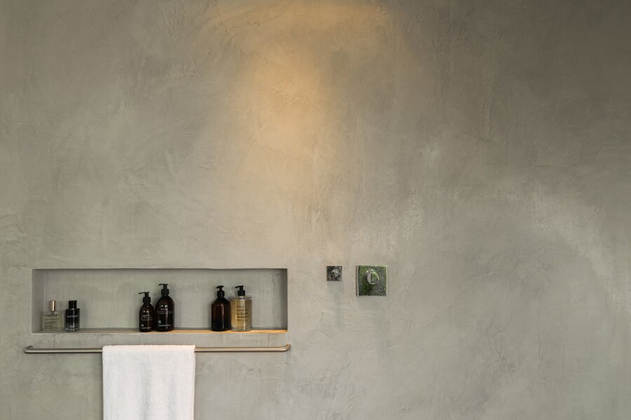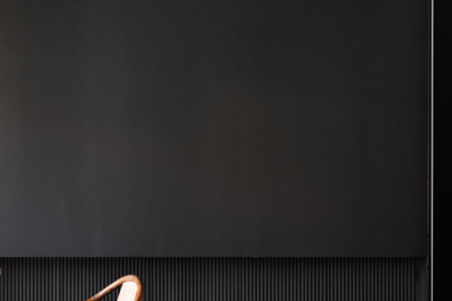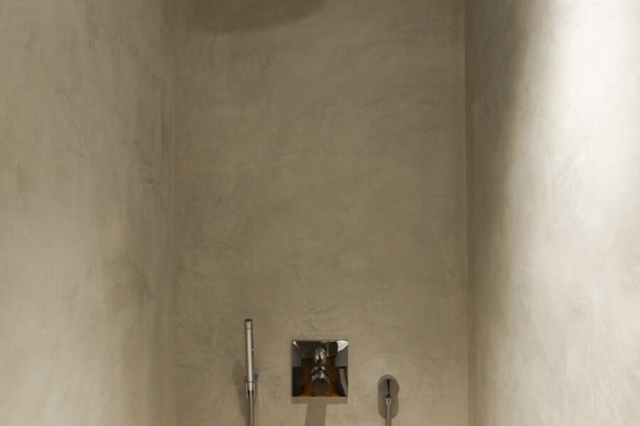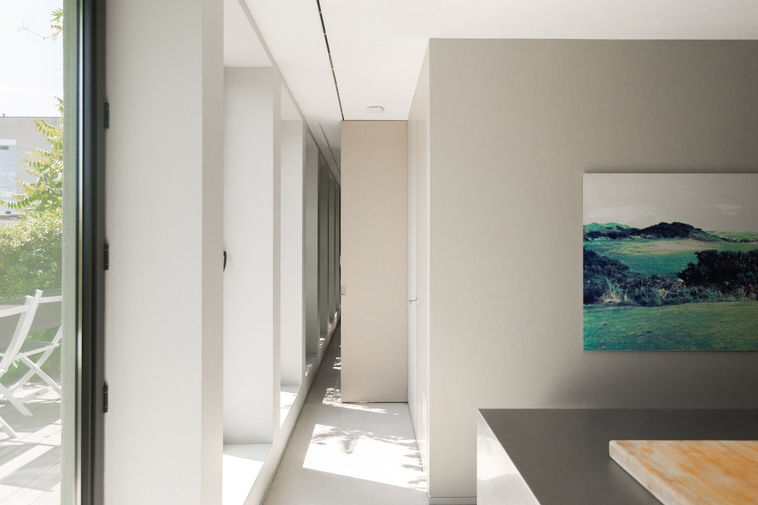 De l'autre côté du hall d'entrée : dressing élégant et chambre à coucher avec salle de bains design ouverte, qui se prolonge à nouveau par la cuisine. Les nombreuses fenêtres et les plantes de la terrasse apportent à la fois lumière et intimité. Toutes les pièces peuvent être fermées par des portes coulissantes. La terrasse s'étend également sur toute la longueur, pour les journaux et le café au soleil du matin.