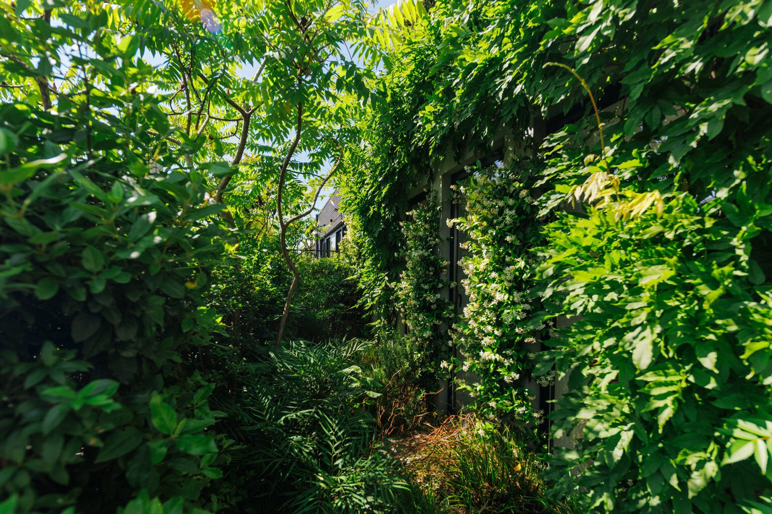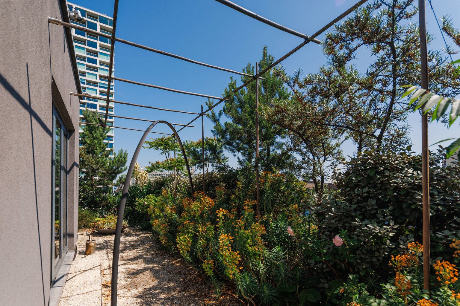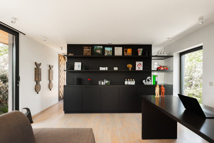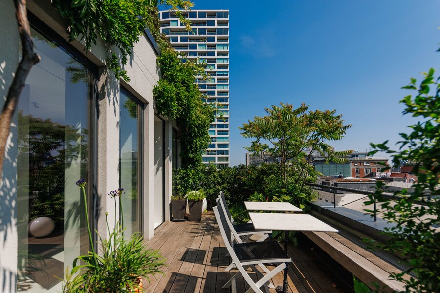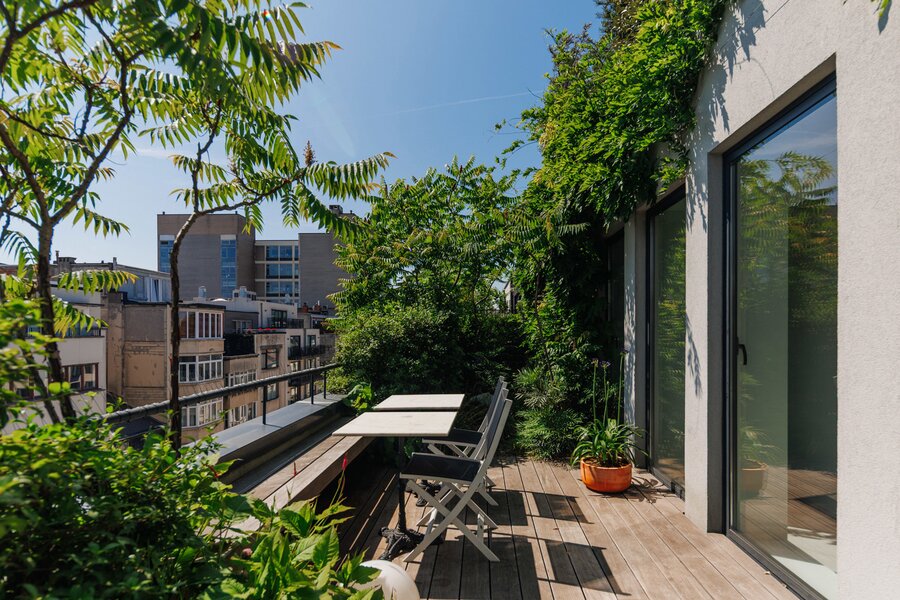 L'escalier mène à la chambre +7, qui comprend maintenant un bureau, une cuisine d'été et des toilettes séparées, ou une troisième chambre. Ce qui attire l'attention ? Le phénoménal jardin sur le toit de pas moins de 180m2. Conduite de gaz pour un barbecue parfait, système d'arrosage automatique, nouvelle toiture (2021) ... Un plaisir sans souci ! Système Sonos, chauffage à air chaud avec refroidissement et rangement supplémentaire derrière des portes à hauteur de plafond.
