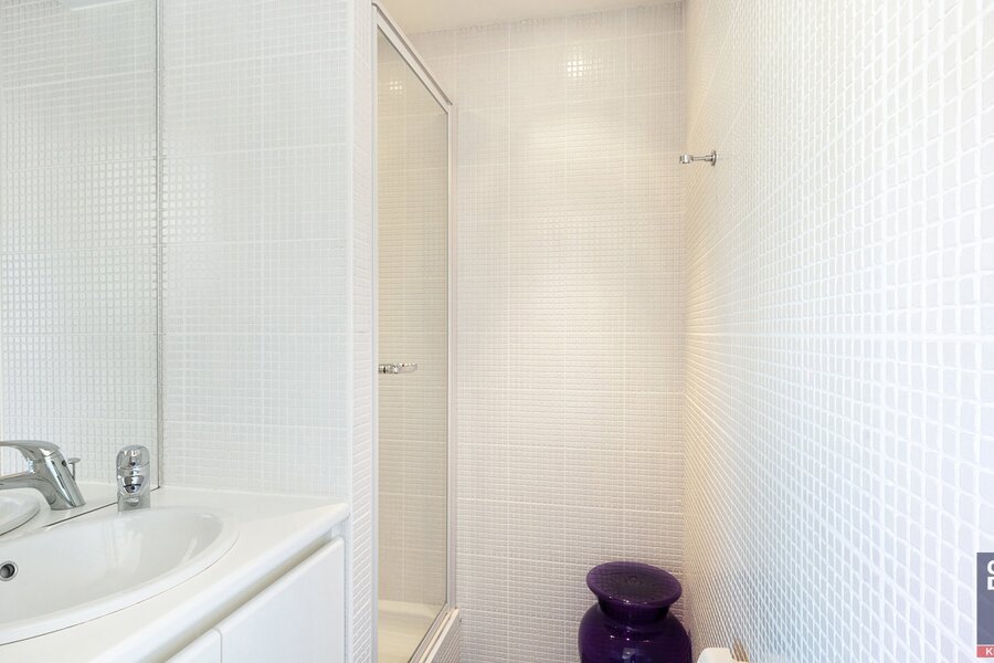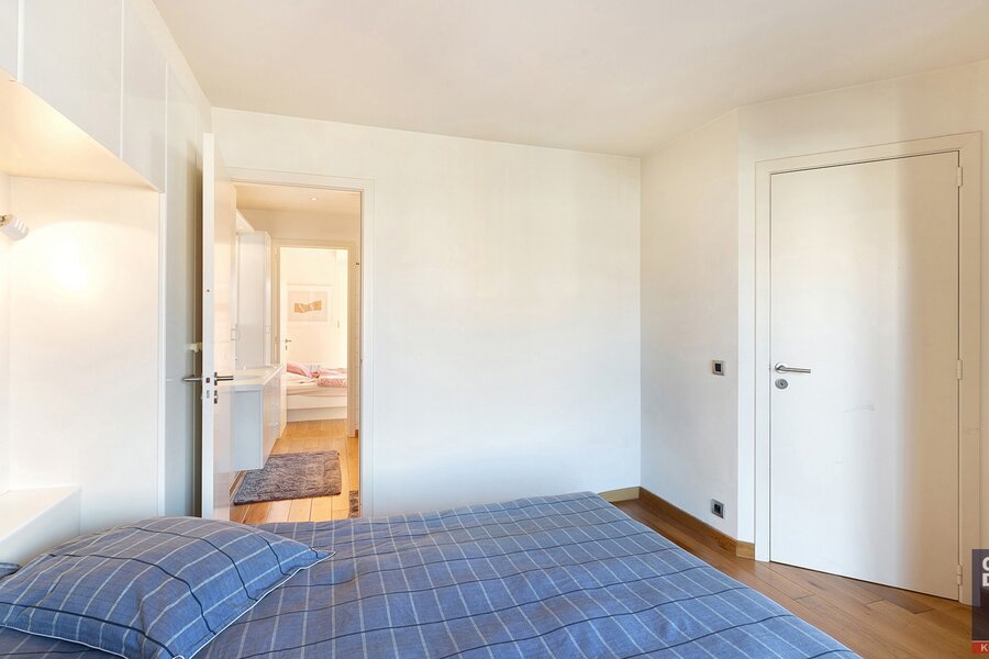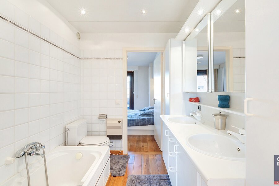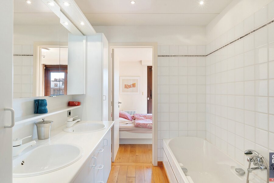 Composition: 5ème V. : Entrée avec vestiaire et toilettes pour invités. Salon et salle à manger lumineux donnant sur deux très grandes terrasses ensoleillées (sud-ouest environ 55m² avec store et sud-est environ 35m²). Cuisine équipée séparée. 2 chambres doubles, l'une ouvrant sur la terrasse avant et l'autre sur la terrasse arrière. Salle de bain commune avec double lavabo, baignoire et toilettes. Local de rangement. 6ème étage : palier spacieux (avec coin salon aménagé) avec toilettes séparées. 4 chambres doubles, dont l'une est aménagée en salle de télévision. 2 salles de douche communicantes et 1 salle de bain communicante. Local de rangement avec branchement pour machine à laver.