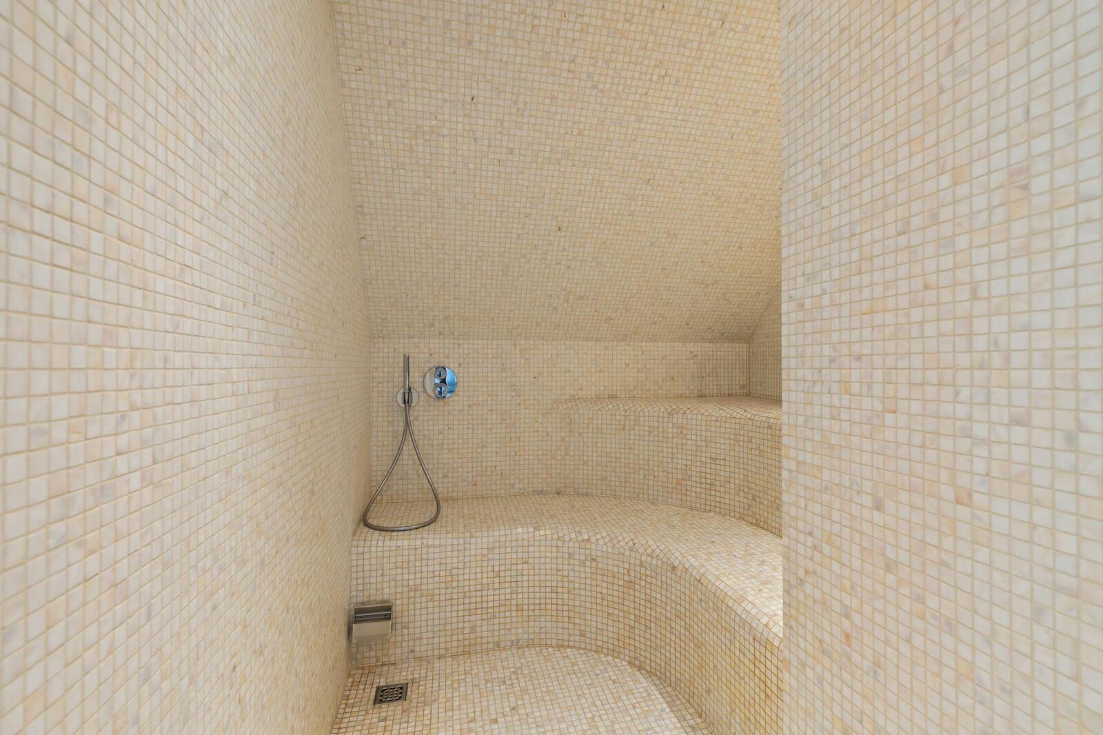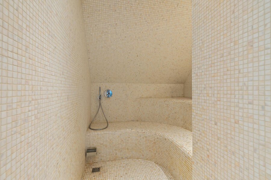 Mais ce qui rend cette maison vraiment unique, c'est son espace bien-être privé : un hammam en mosaïque entièrement carrelé, un sauna, une douche à effet pluie et trois douches au total. Détente garantie sans jamais quitter la maison.
