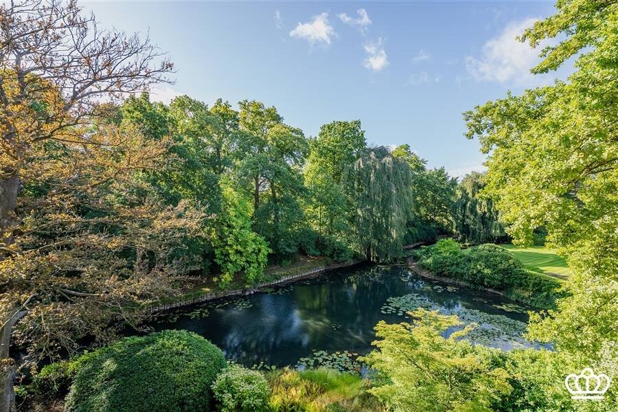 Dubbele deuren leiden naar de ruime leefruimte met haard en schuifraam naar het zuidgerichte terras van ca. 16 m², voorzien van een automatische zonnetent en een prachtig uitzicht op het park met grote vijver.