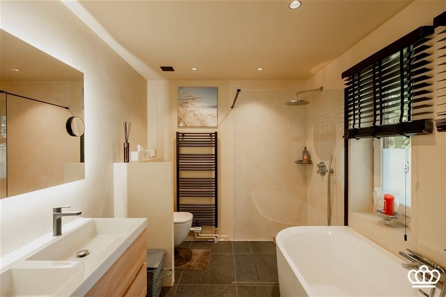 Au fond se trouve la chambre principale avec des armoires encastrées et une salle de bains attenante avec baignoire, grande douche à l'italienne avec douche à effet de pluie, double lavabo, radiateur sèche-serviettes et toilettes.