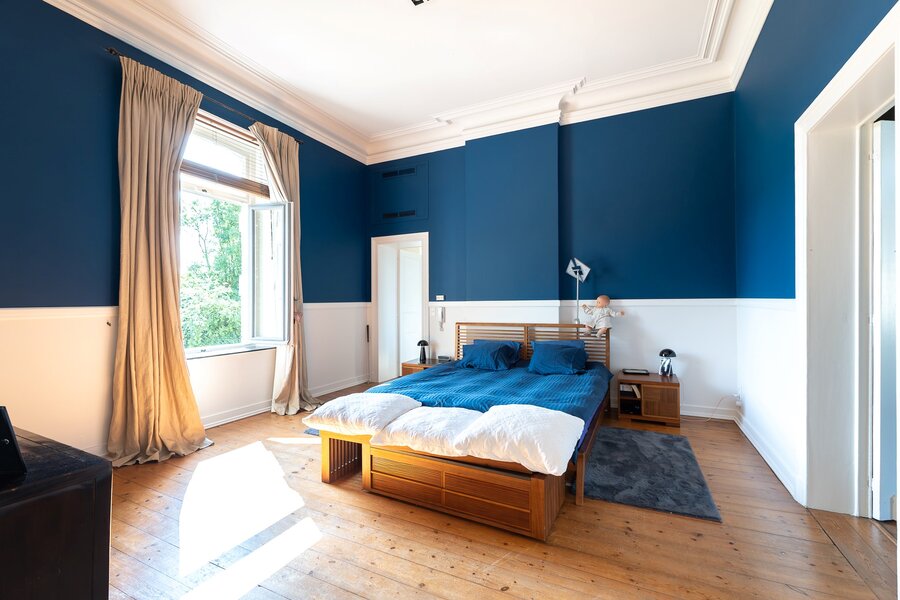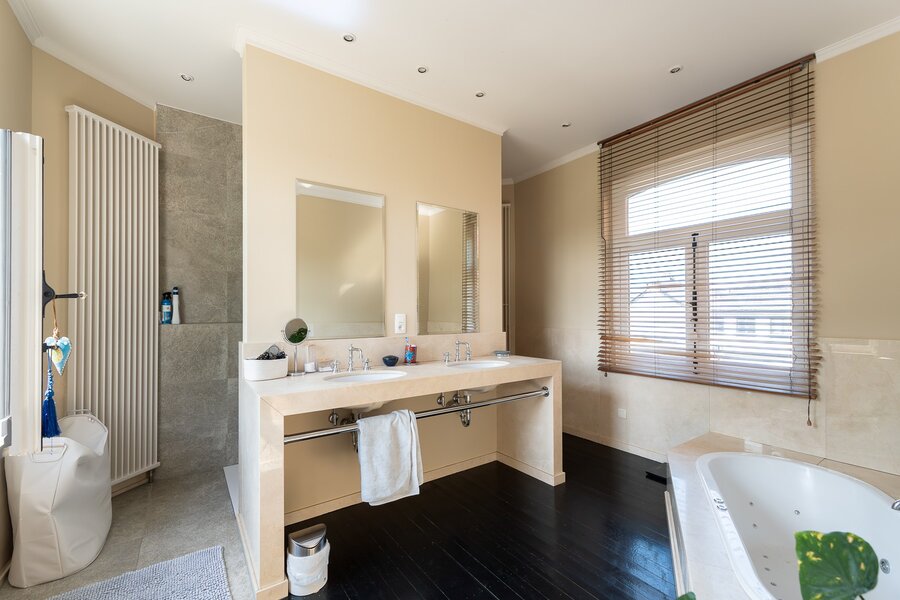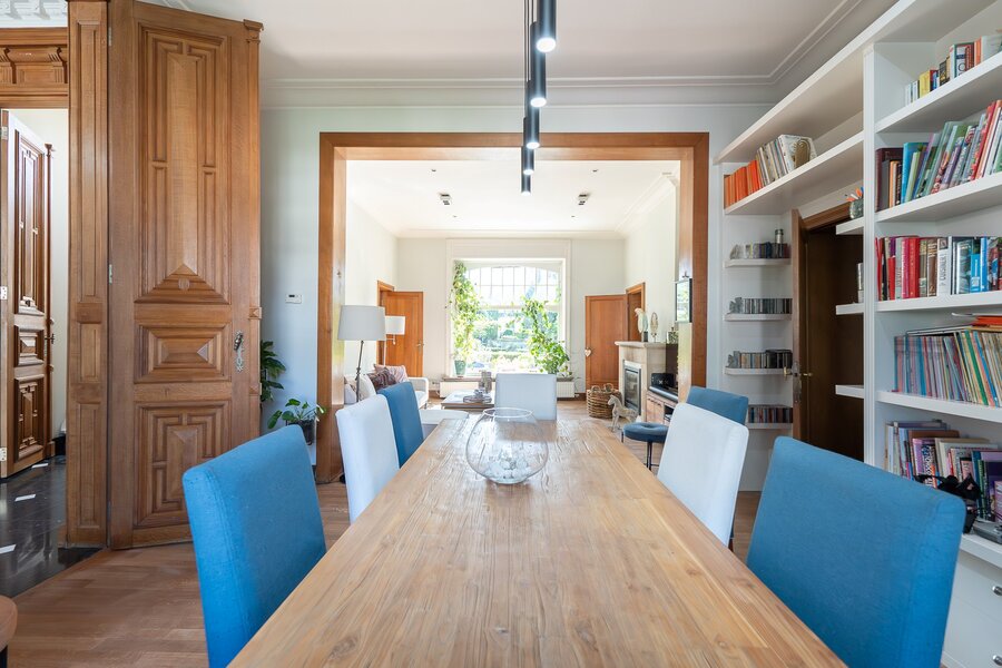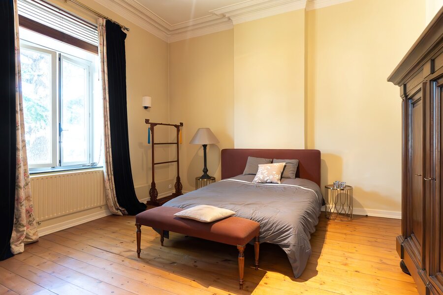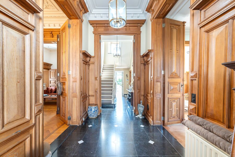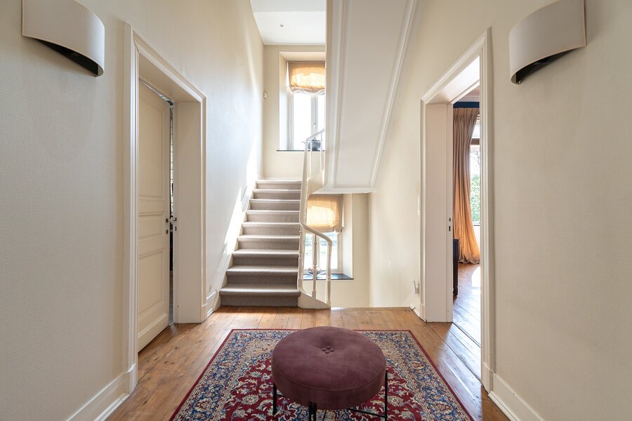 L'entrée principale révèle un hall de réception aux proportions généreuses, précédant un salon de ± 40 m² orné d'une cheminée en marbre blanc et de boiseries d'époque. La salle à manger attenante de ± 35 m² communique avec une cuisine traditionnelle équipée donnant sur les jardins. L'étage noble accueille une suite parentale de ± 30 m² avec cabinet de toilette attenant, trois chambres supplémentaires et une salle de bain familiale aux carreaux de ciment d'origine. Les hauteurs sous plafond de 3m50 et les fenêtres à meneaux préservent l'authenticité architecturale.
