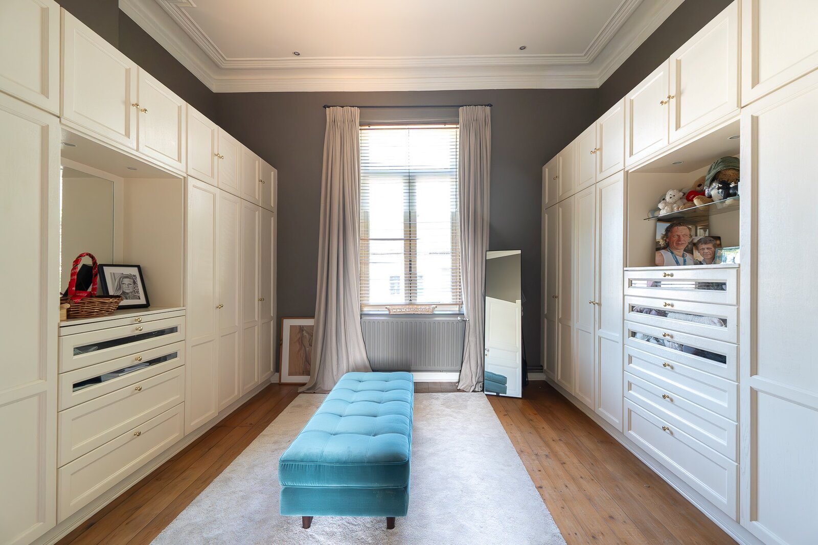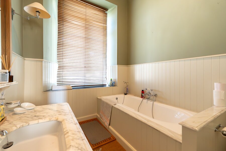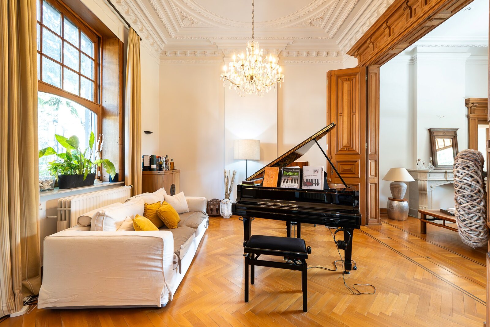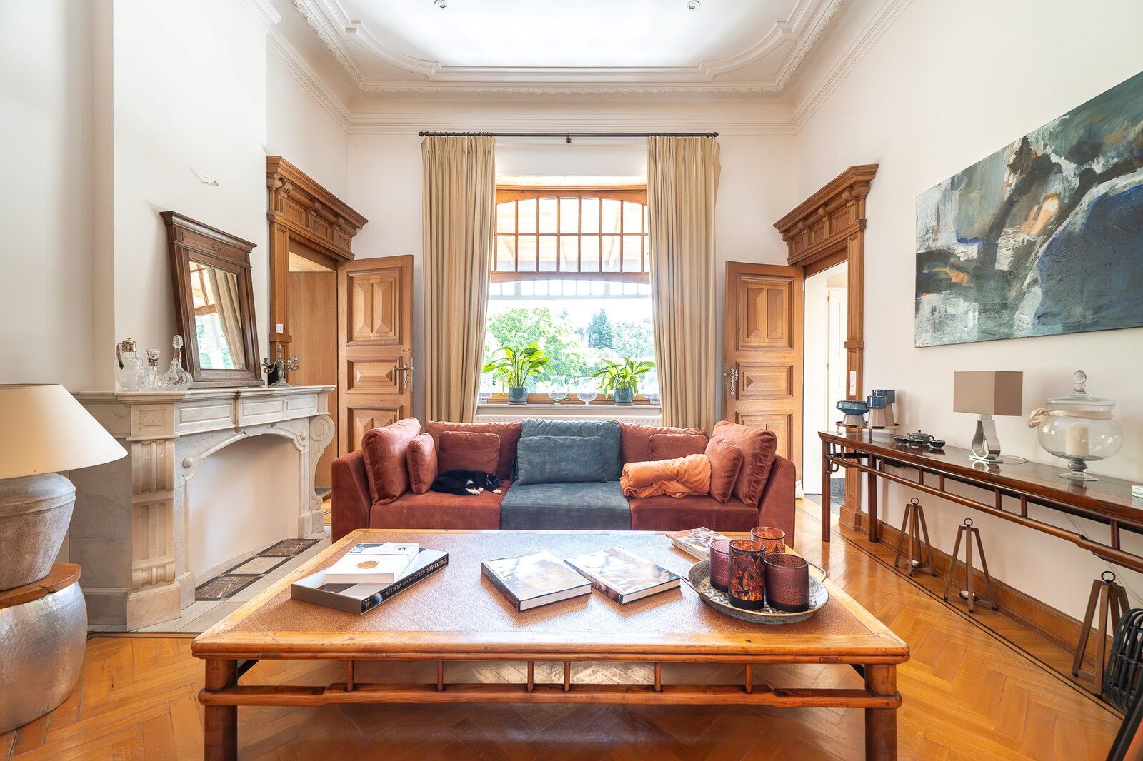 L'entrée principale révèle un hall de réception aux proportions généreuses, précédant un salon de ± 40 m² orné d'une cheminée en marbre blanc et de boiseries d'époque. La salle à manger attenante de ± 35 m² communique avec une cuisine traditionnelle équipée donnant sur les jardins. L'étage noble accueille une suite parentale de ± 30 m² avec cabinet de toilette attenant, trois chambres supplémentaires et une salle de bain familiale aux carreaux de ciment d'origine. Les hauteurs sous plafond de 3m50 et les fenêtres à meneaux préservent l'authenticité architecturale.