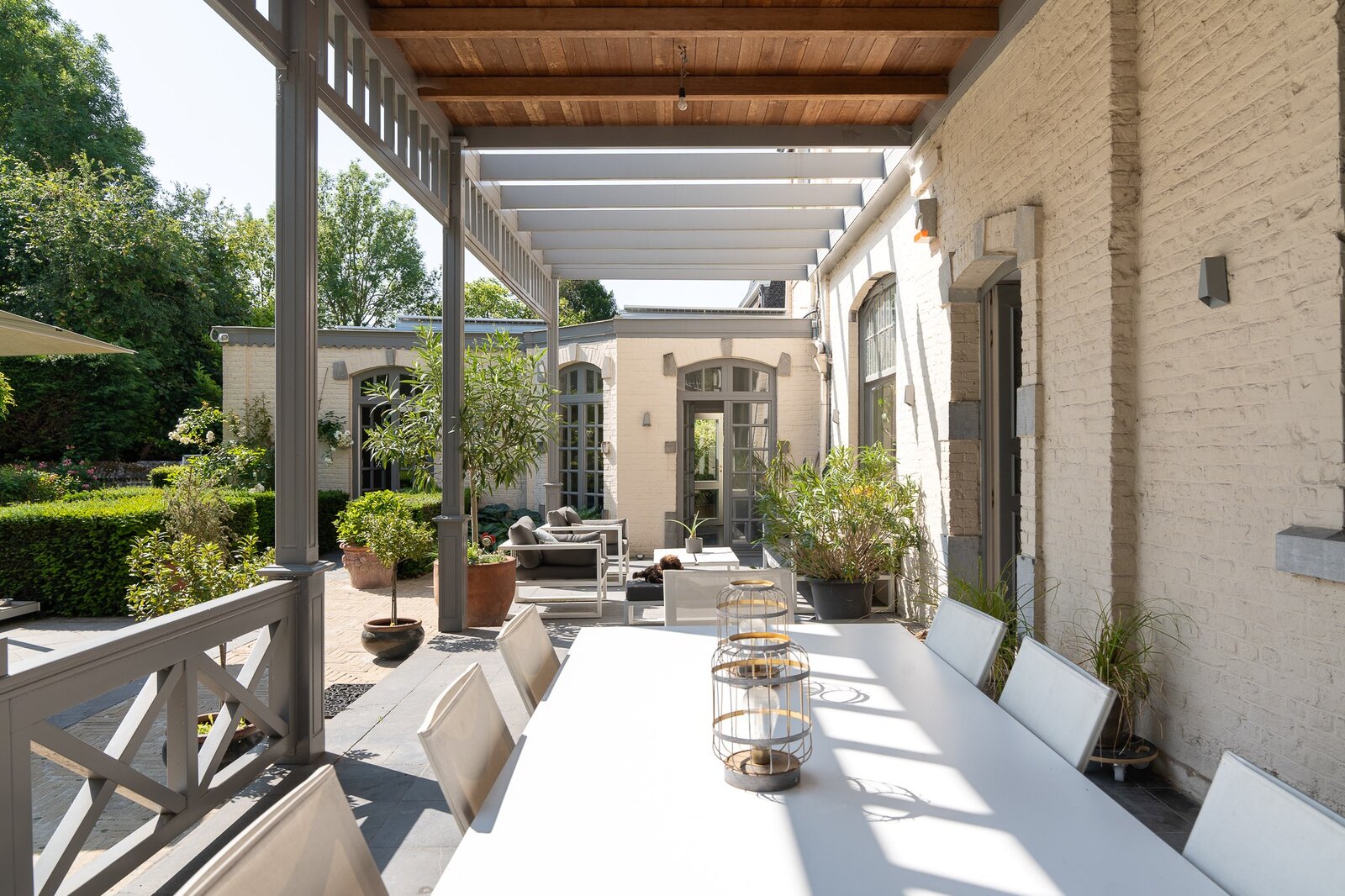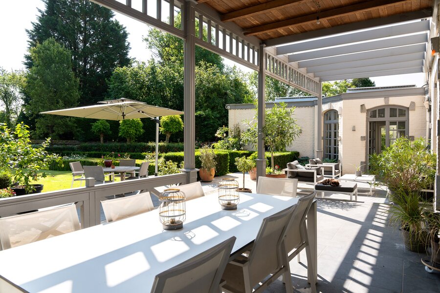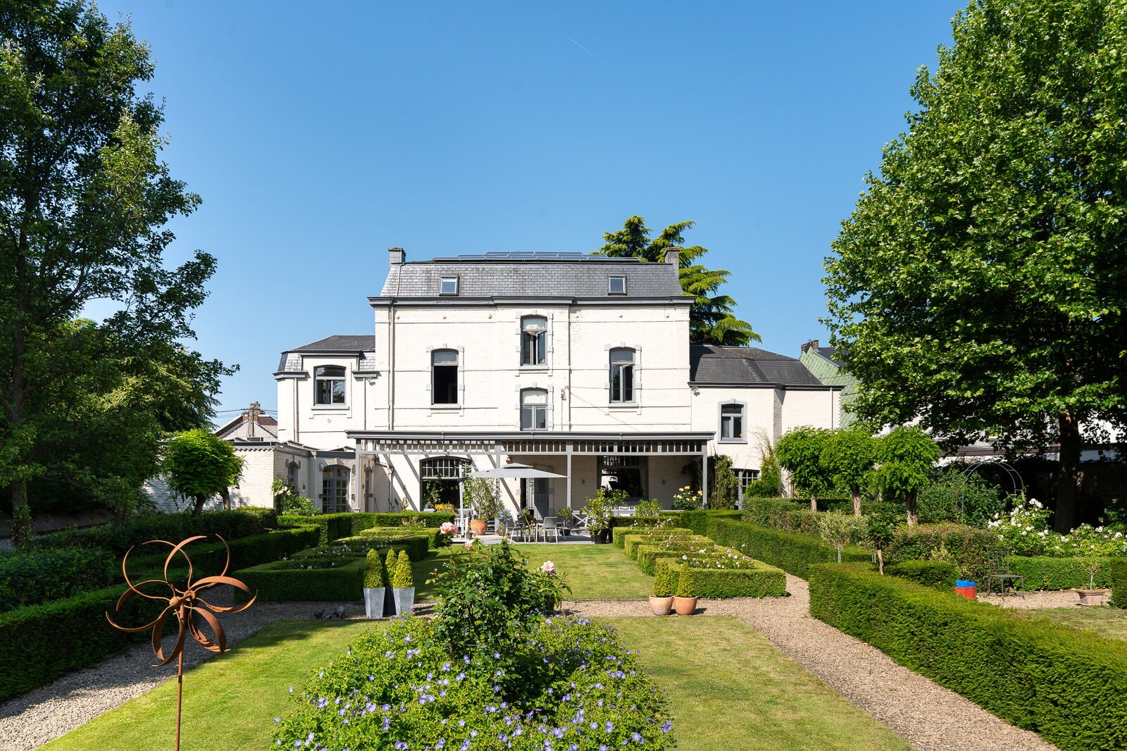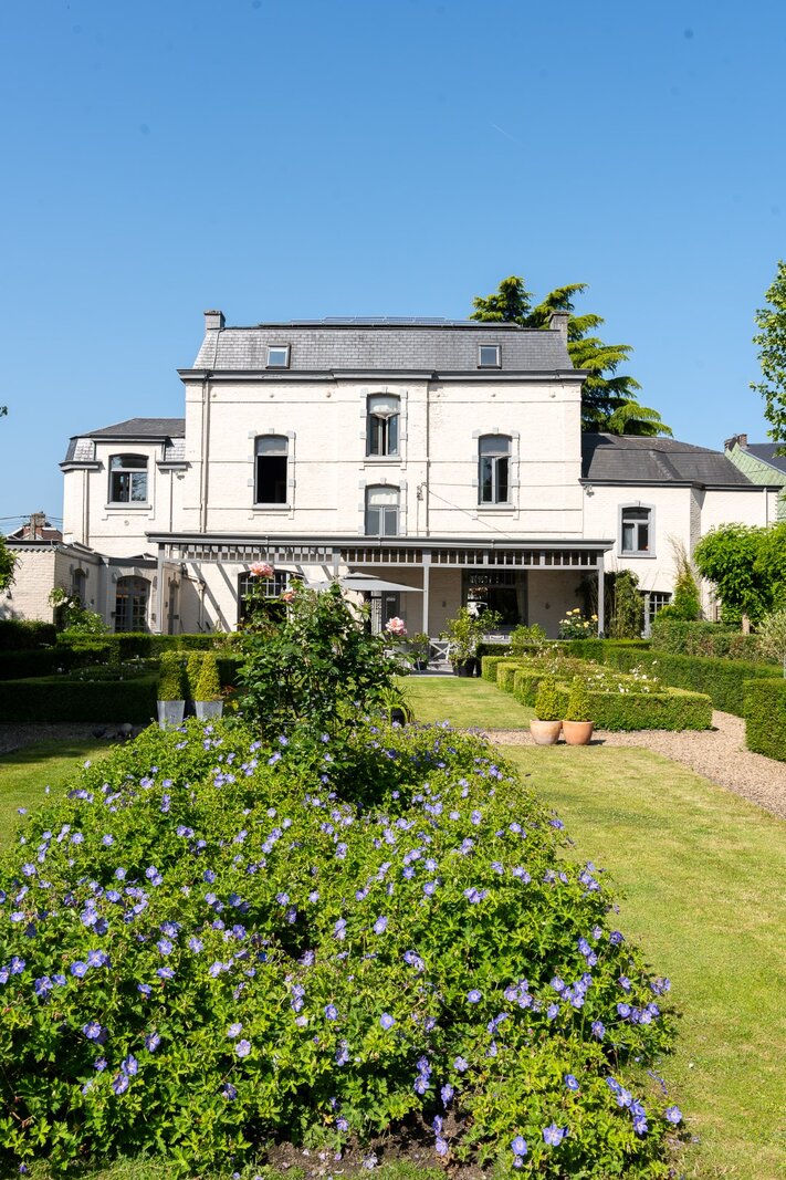 L'aile latérale développe un espace professionnel de ± 80 m² avec accès indépendant, comprenant bureau de réception, deux cabinets de consultation et sanitaires. Les jardins à la française, structurés par des buis taillés et des allées gravillonnées, offrent une perspective ordonnée depuis les réceptions principales.