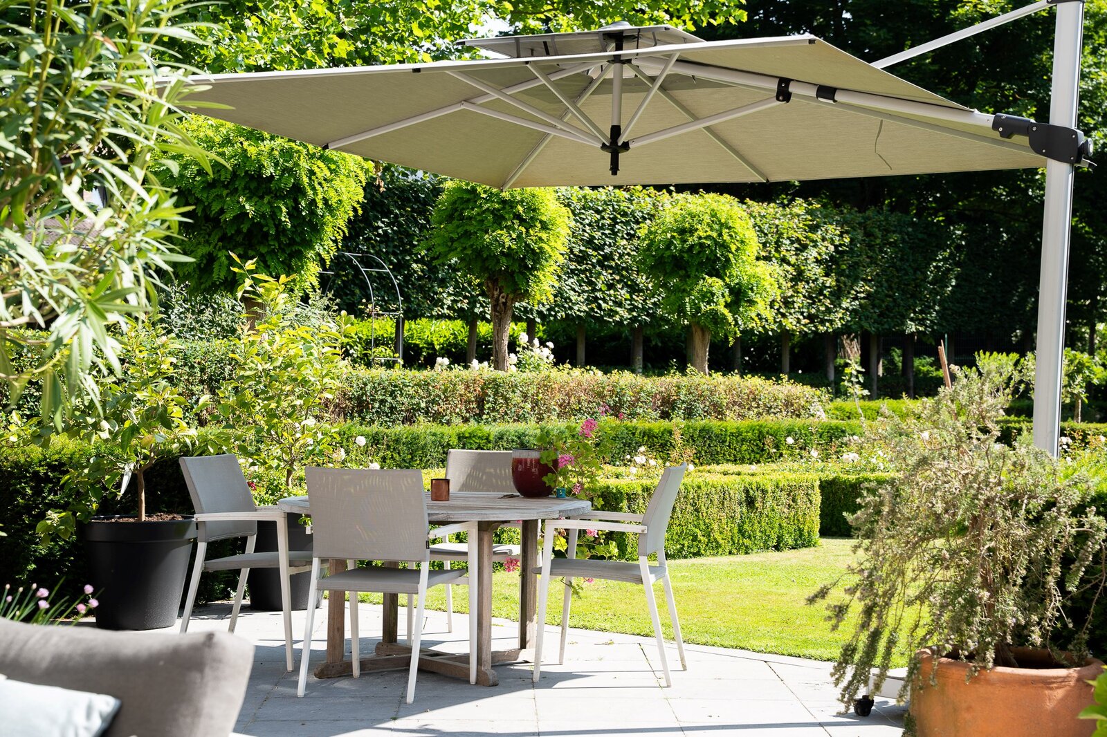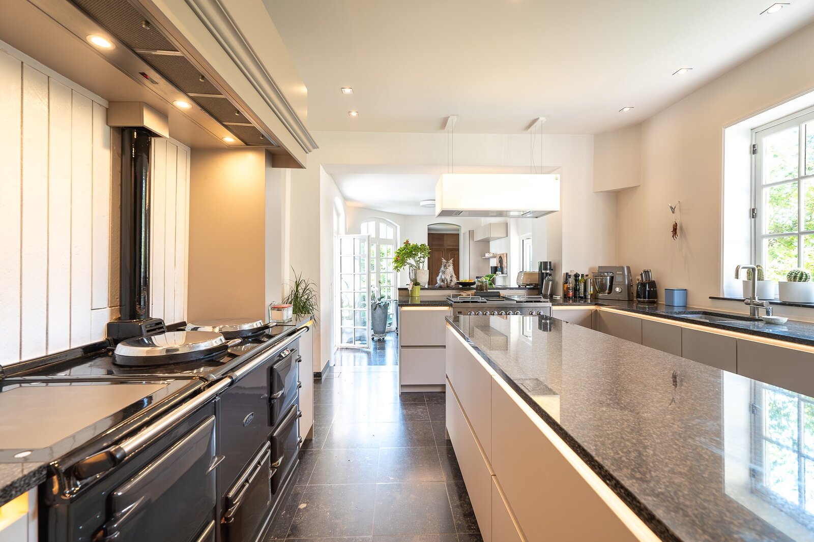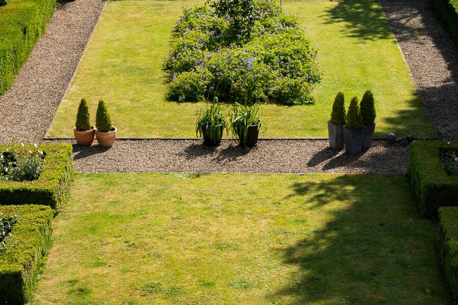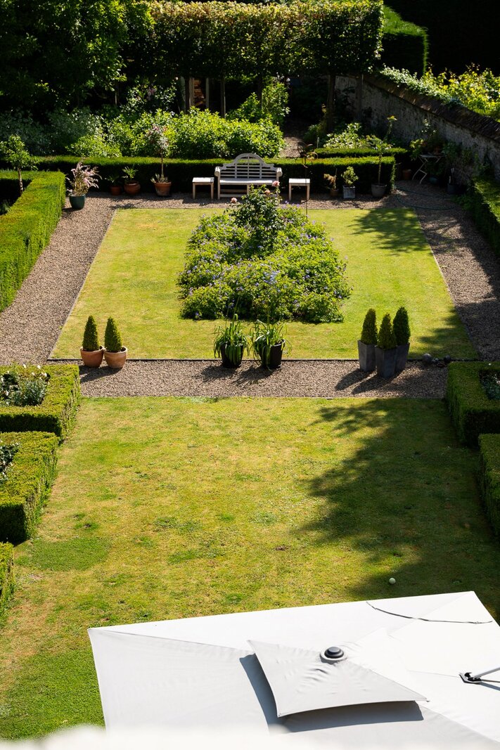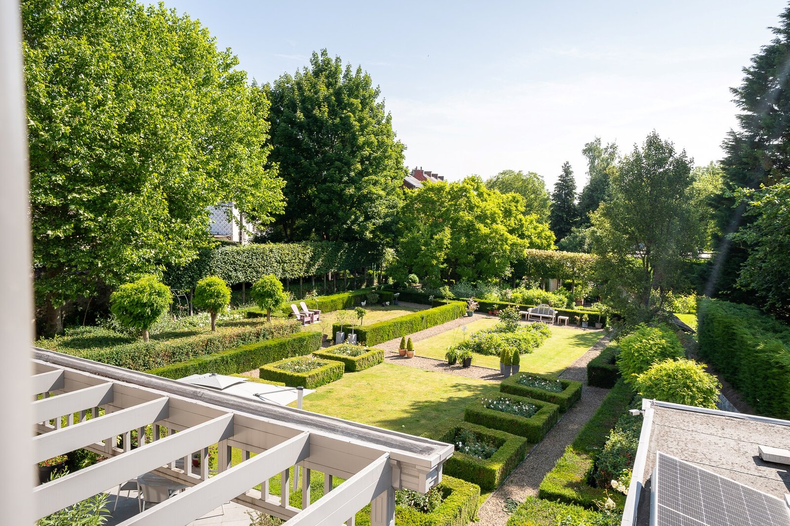 L'aile latérale développe un espace professionnel de ± 80 m² avec accès indépendant, comprenant bureau de réception, deux cabinets de consultation et sanitaires. Les jardins à la française, structurés par des buis taillés et des allées gravillonnées, offrent une perspective ordonnée depuis les réceptions principales.