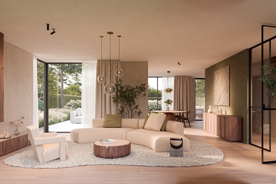De ruime, lichtrijke leefruimtes bieden een aangename woonbeleving en sluiten naadloos aan op de westelijk georiënteerde tuin en het terras, waar u tot in de late uurtjes van de zon kunt genieten.