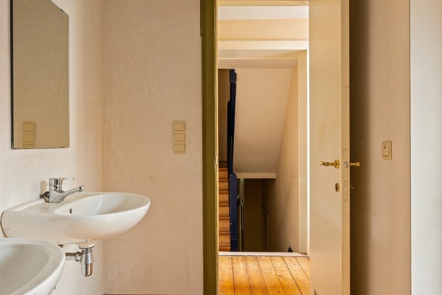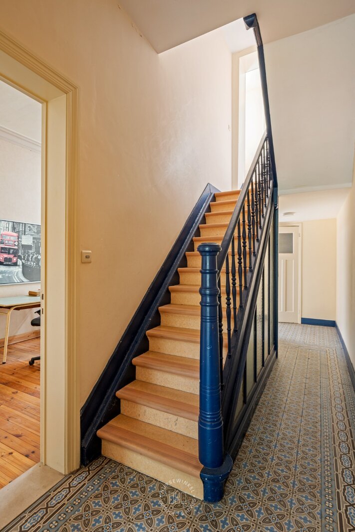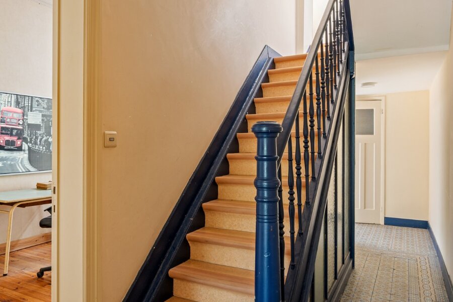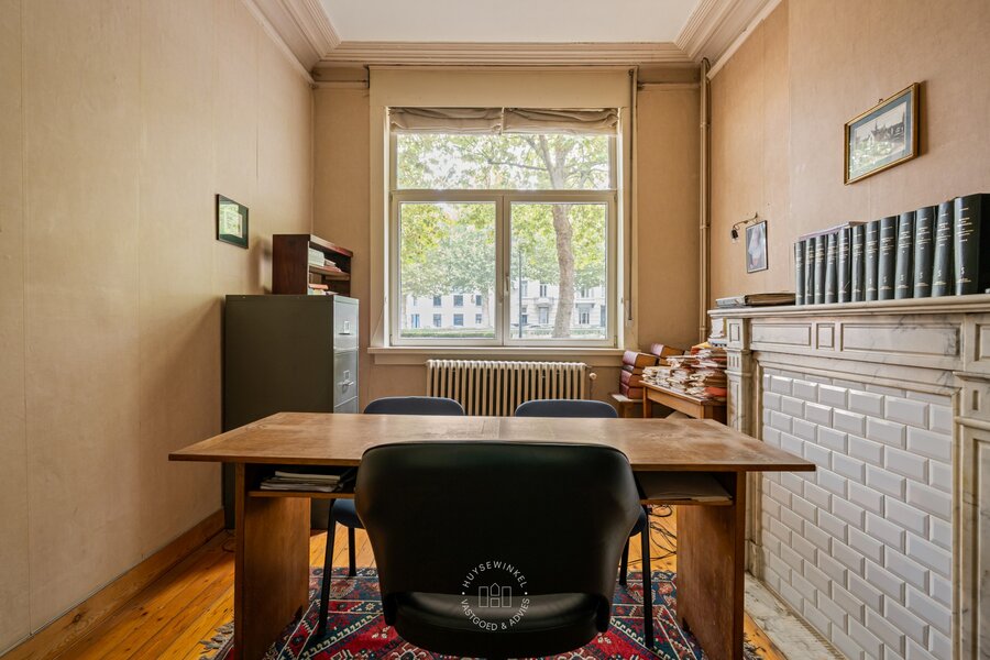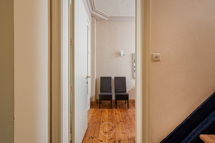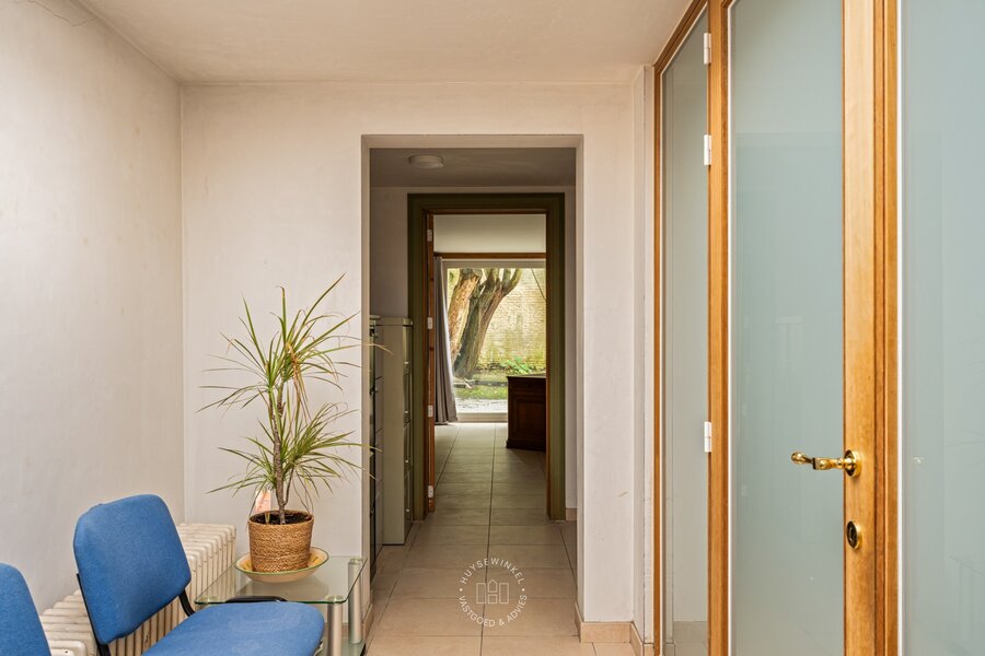 Bij het binnenkomen valt meteen de authentieke inkomhal op met zijn hoge plafonds die het charmante karakter van de woning versterken. De woning werd doorheen de jaren gebruikt als kantoor en biedt vandaag een prachtige basis voor wie wil renoveren en volledig naar eigen smaak wil inrichten.