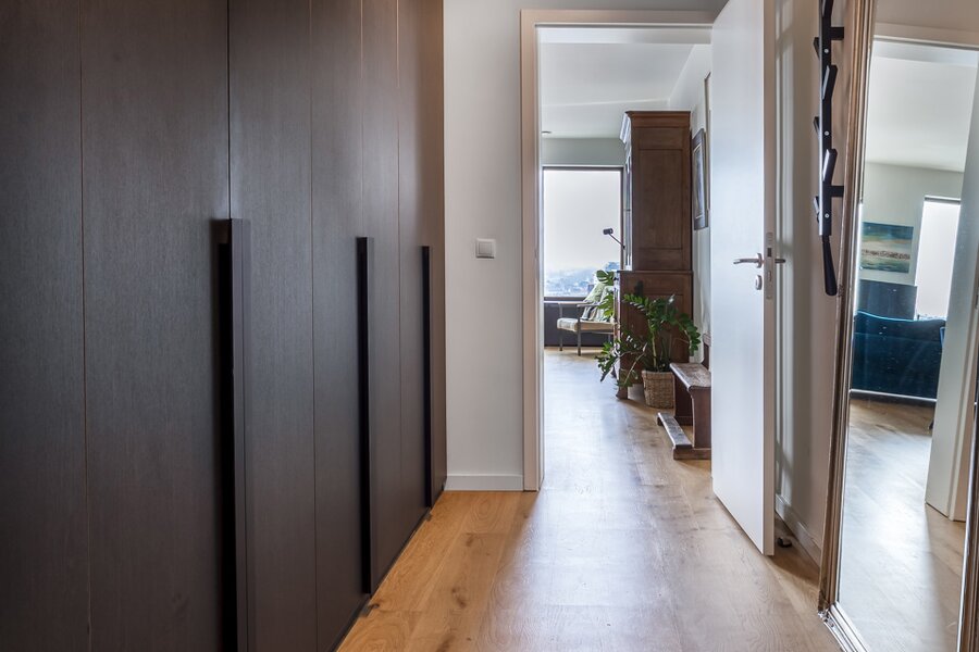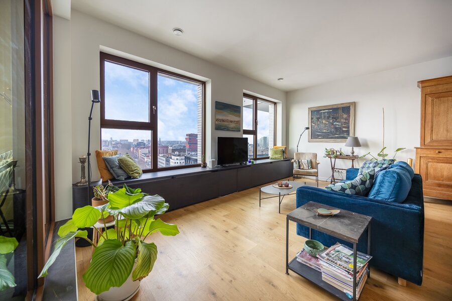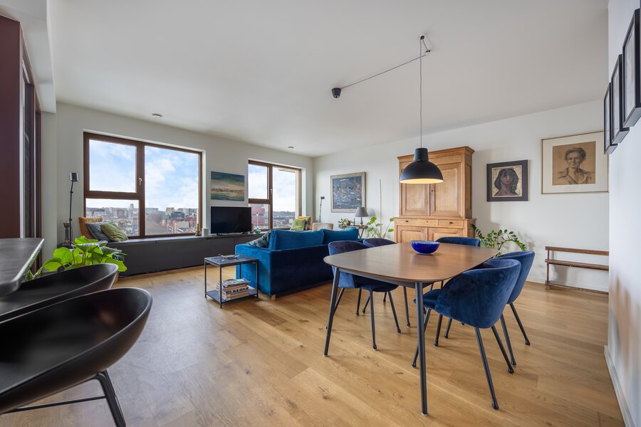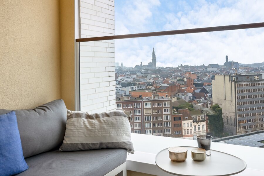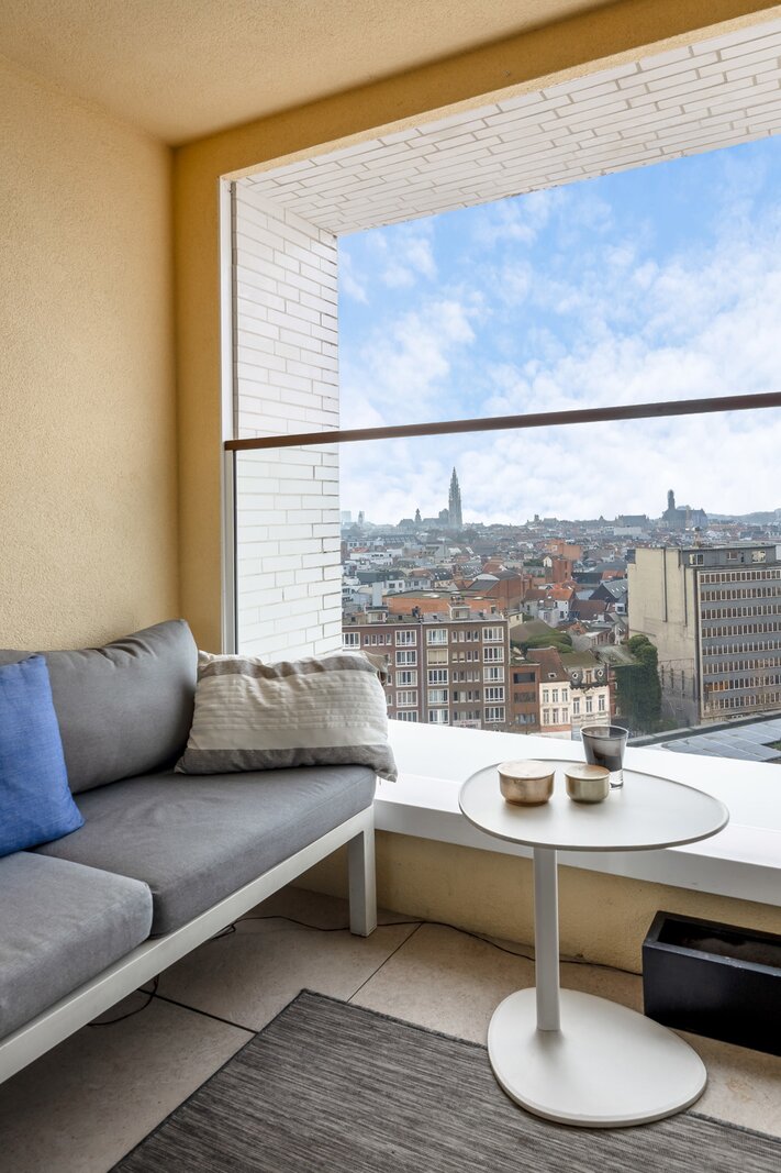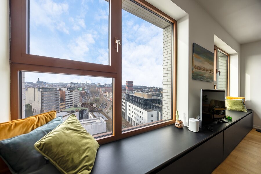 Gelegen op de 11e verdieping van een nieuw gebouw is een prachtig uitzicht over de stad een evidentie. Een overdekt terras maakt dat je ook buiten over de seizoenen heen kan genieten van het zicht.