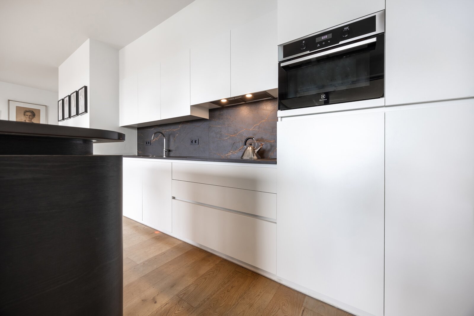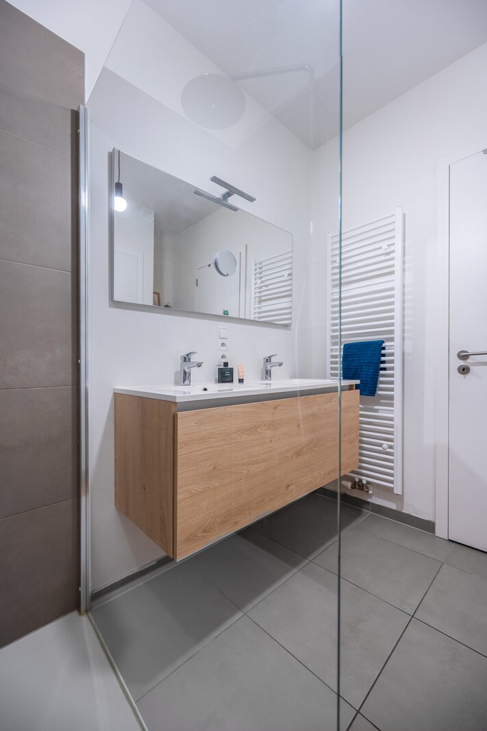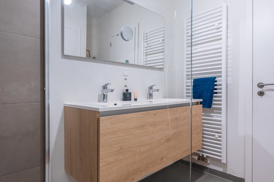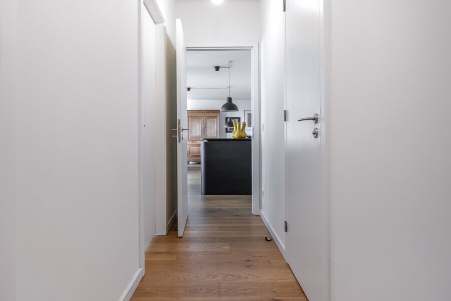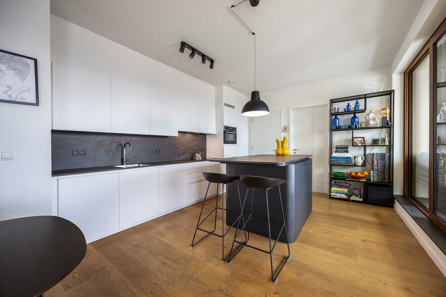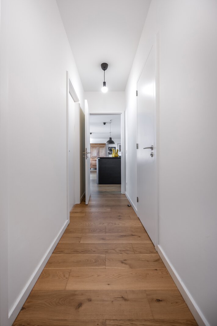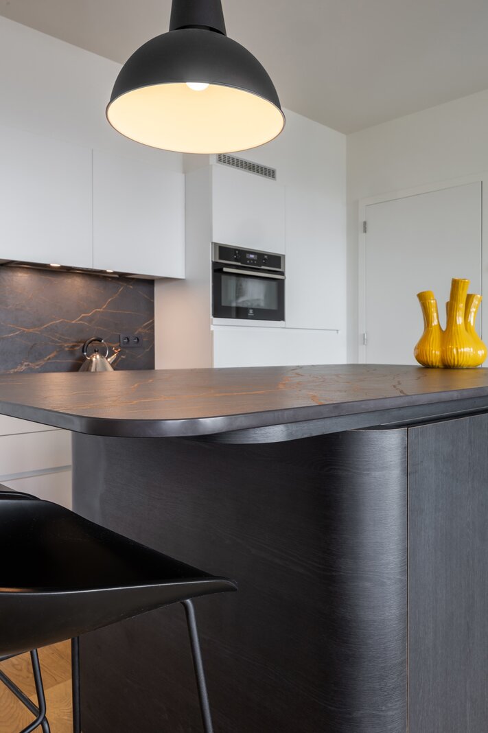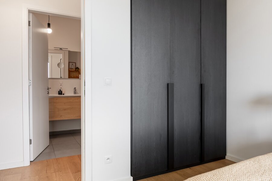 Binnenkomen doen we via een ruime inkomhal met grote inbouwkast. De leefruimte met aansluitend open keuken is zeer lumineus en geniet van een 360 graden zicht over de stad. De keuken met eiland werd voorzien van alle toestellen en een dekton werkblad. Beide slaapkamers beschikken over inbouwkasten en de badkamer is voorzien van een douche en dubbele lavabo. Het toilet is apart voorzien.