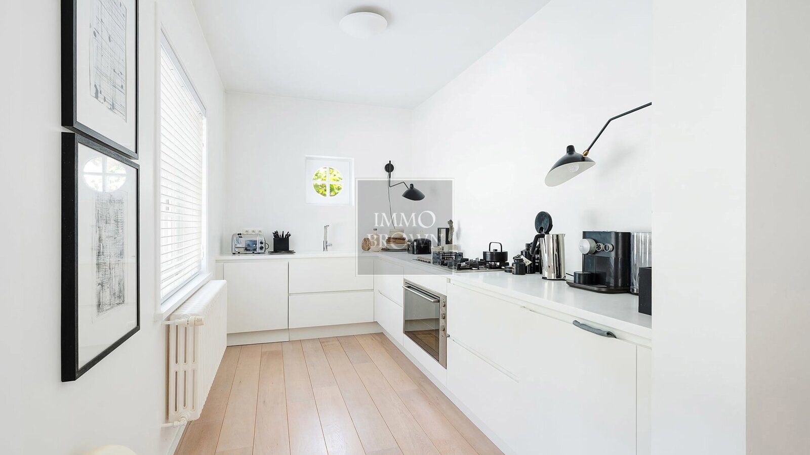 La cuisine entièrement équipée est à la fois pratique et chaleureuse, avec vue sur le jardin paysager et bien entretenu, doté d’une terrasse ensoleillée.