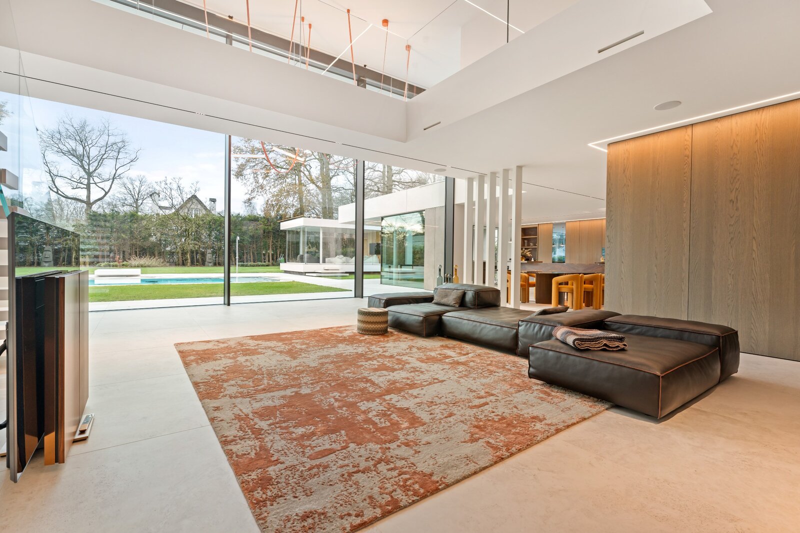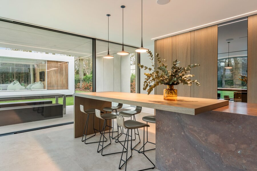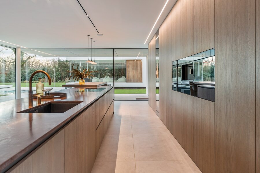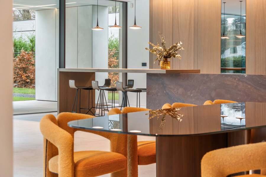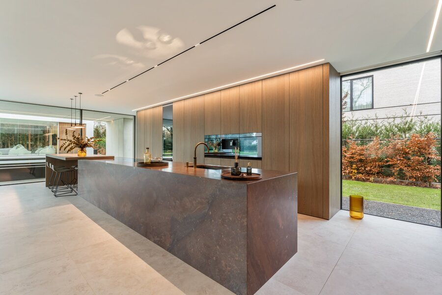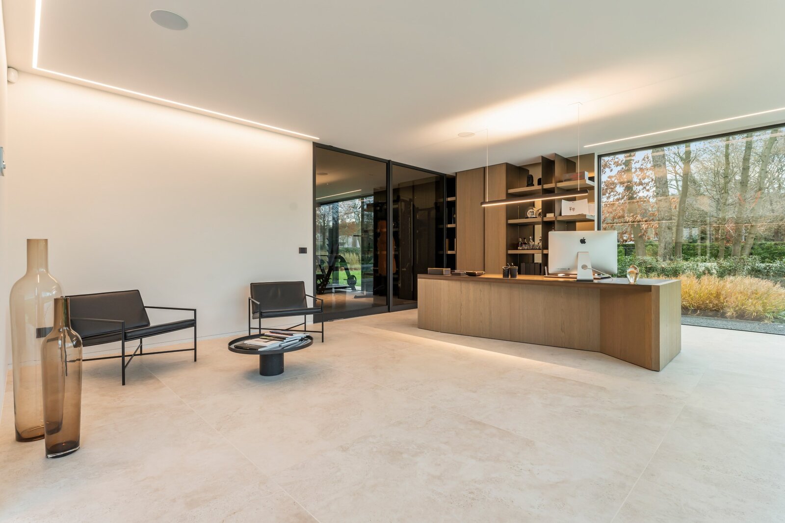 Une cuisine design entièrement équipée avec des appareils de haute qualité, adjacente à un spacieux salon donnant sur un jardin magnifiquement aménagé. À côté du salon se trouve un bureau avec une vue panoramique sur la verdure, idéal pour le travail ou la détente. Derrière le bureau se trouve une salle de fitness spacieuse, parfaitement équipée pour rester actif et en bonne santé à la maison.