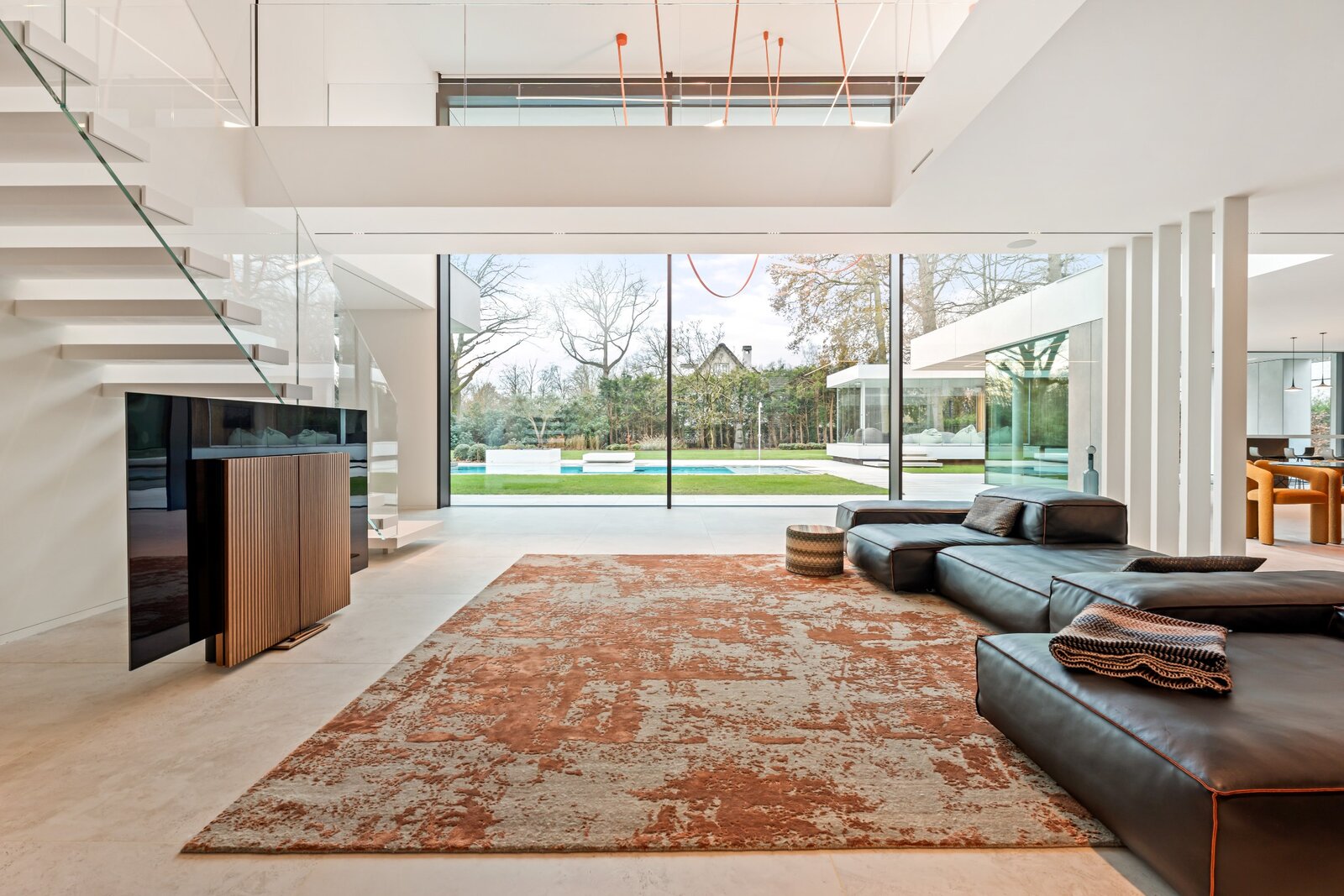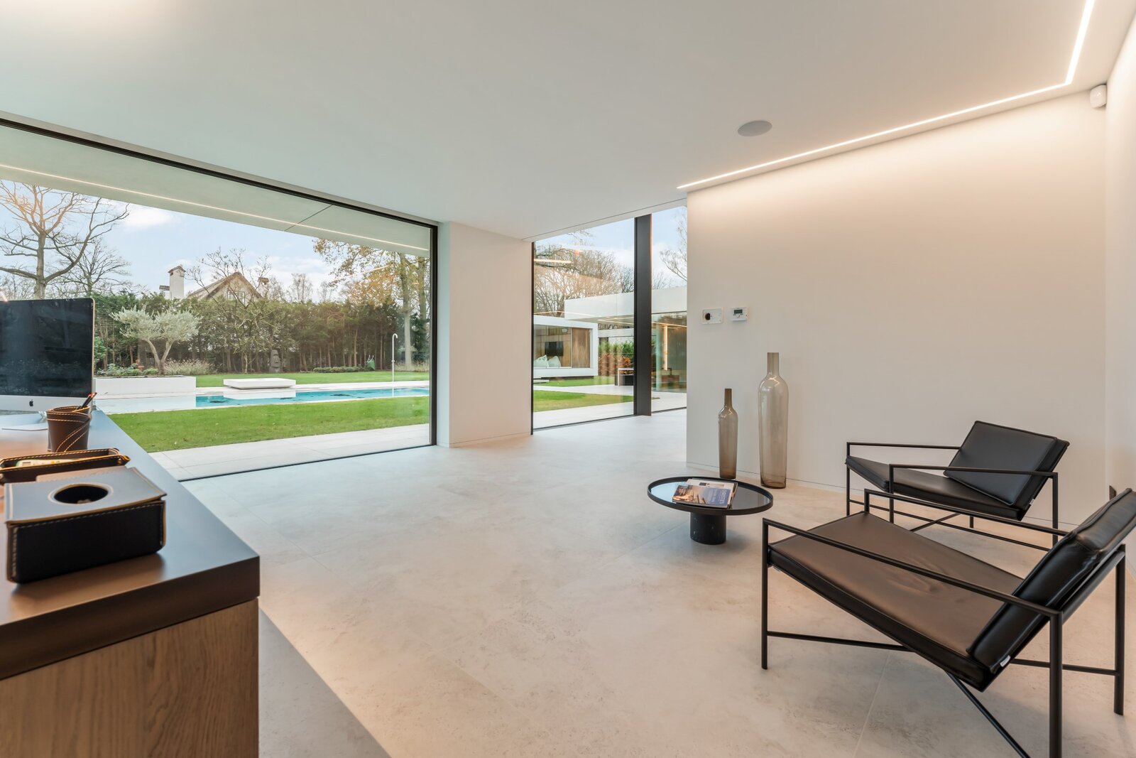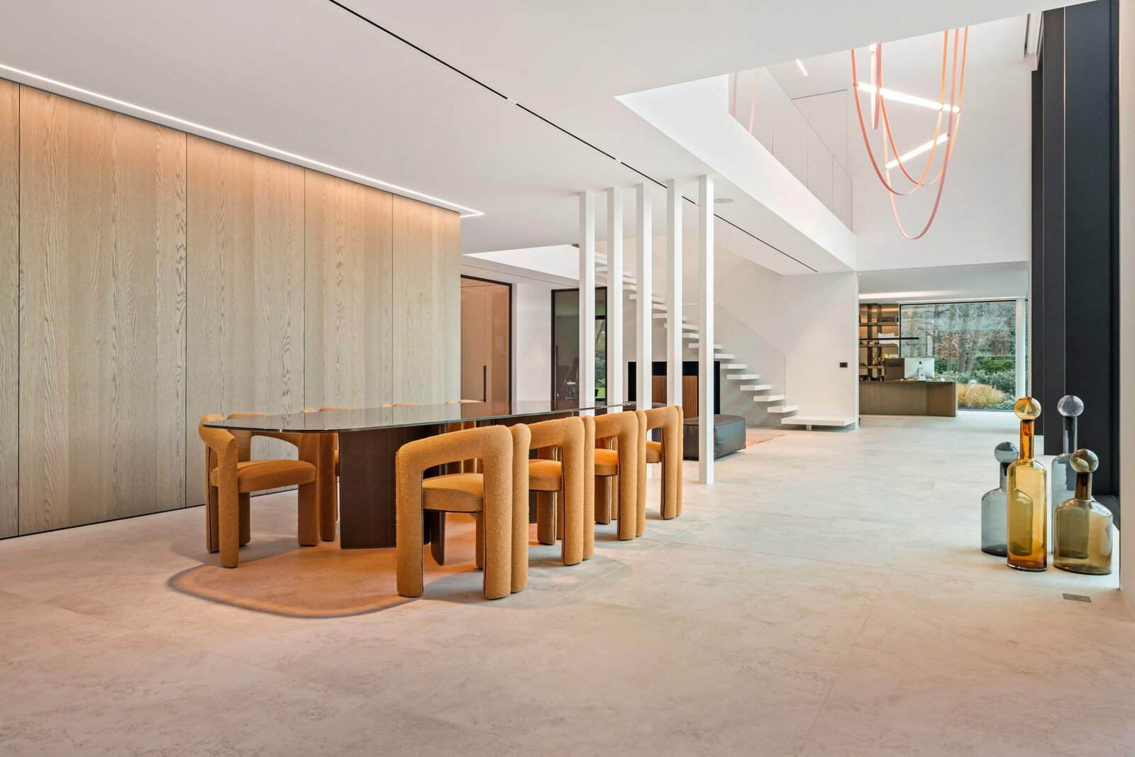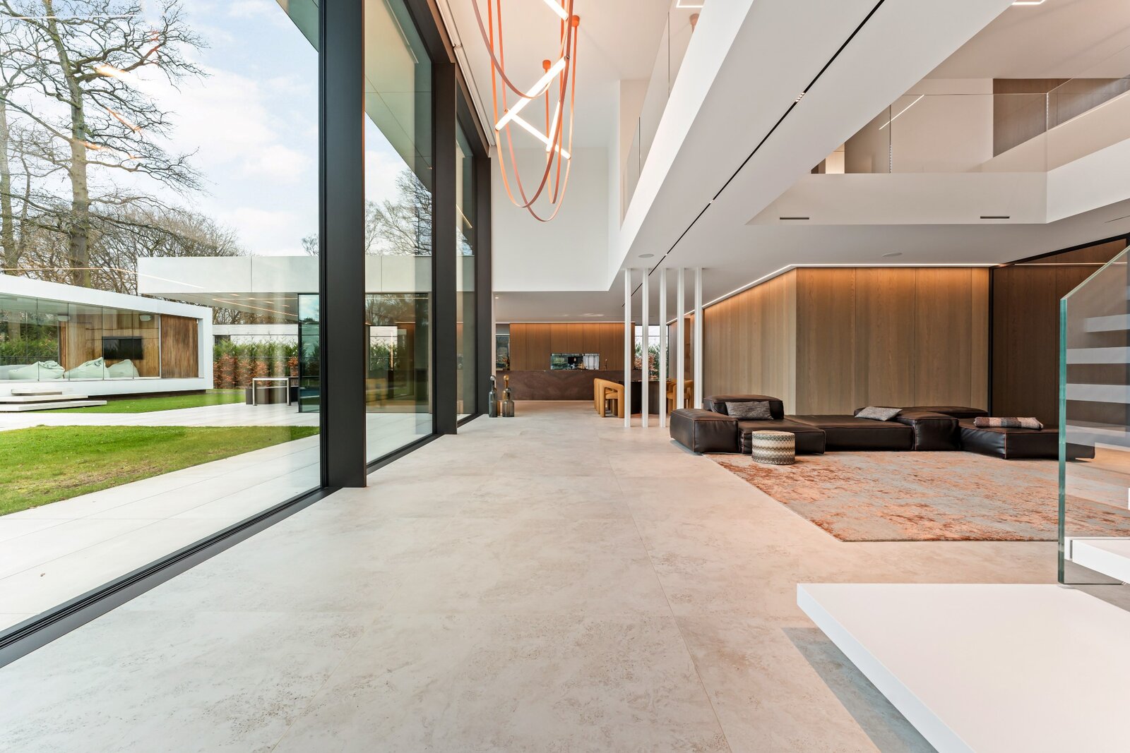 Une cuisine design entièrement équipée avec des appareils de haute qualité, adjacente à un spacieux salon donnant sur un jardin magnifiquement aménagé. À côté du salon se trouve un bureau avec une vue panoramique sur la verdure, idéal pour le travail ou la détente. Derrière le bureau se trouve une salle de fitness spacieuse, parfaitement équipée pour rester actif et en bonne santé à la maison.