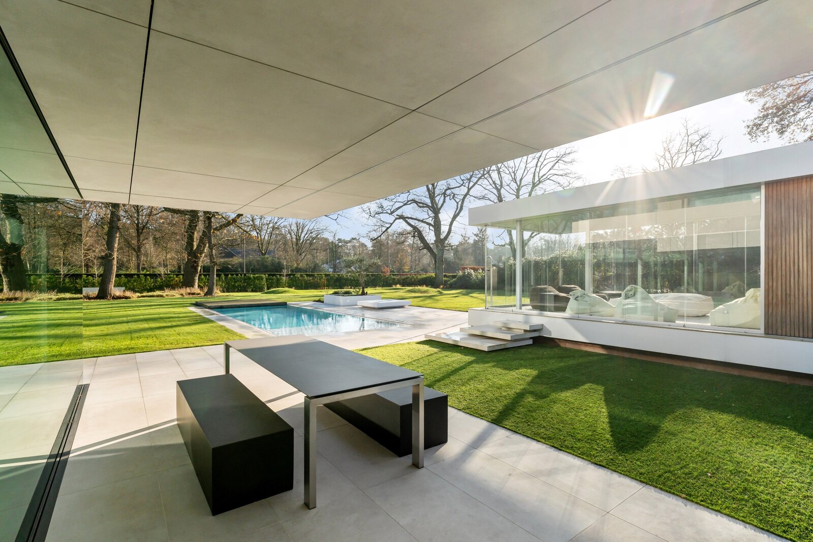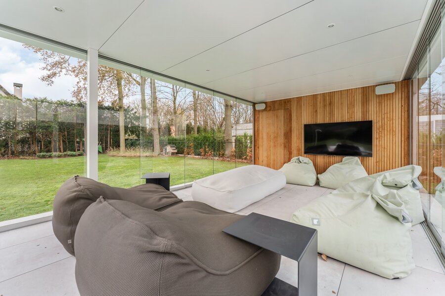 Le jardin respire l'élégance pure avec une piscine à débordement et une terrasse couverte, idéale pour de longues journées d'été. Un salon en verre au bord de la piscine complète le tableau et offre un espace chaleureux pour se détendre ou recevoir des invités.