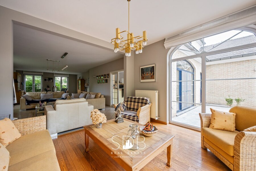 De royale woonkamer is ingedeeld in een gezellige eetruimte en 2 sfeervolle zithoeken waarvan 1 rond een centraal geplaatste houthaard. Diverse raampartijen zorgen voor een overvloed aan natuurlijk daglicht.