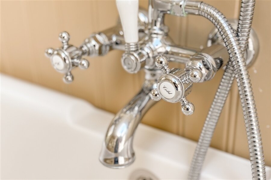 Salle de bains luxueuse avec baignoire, douche et meuble lavabo. Toilette.