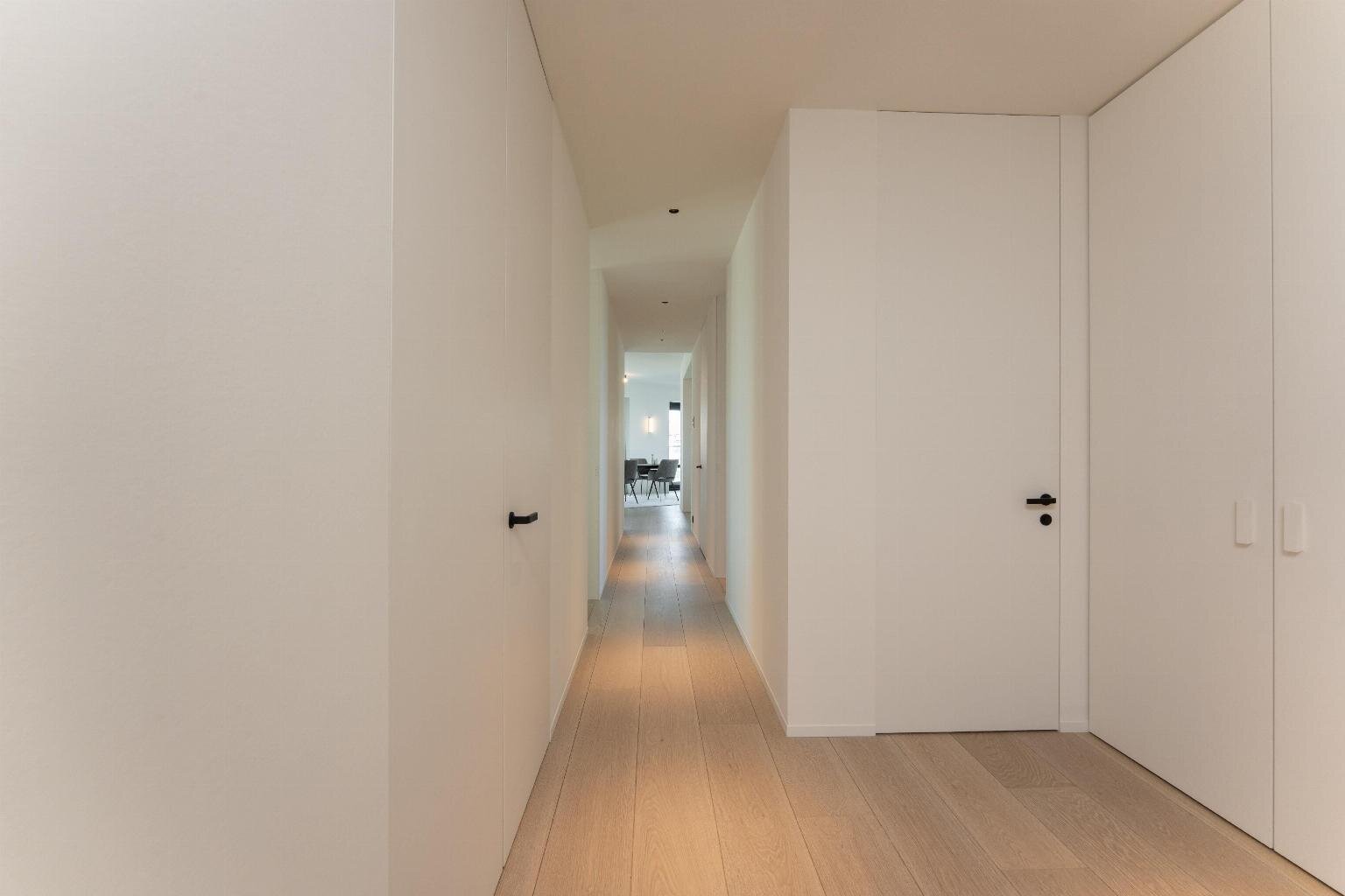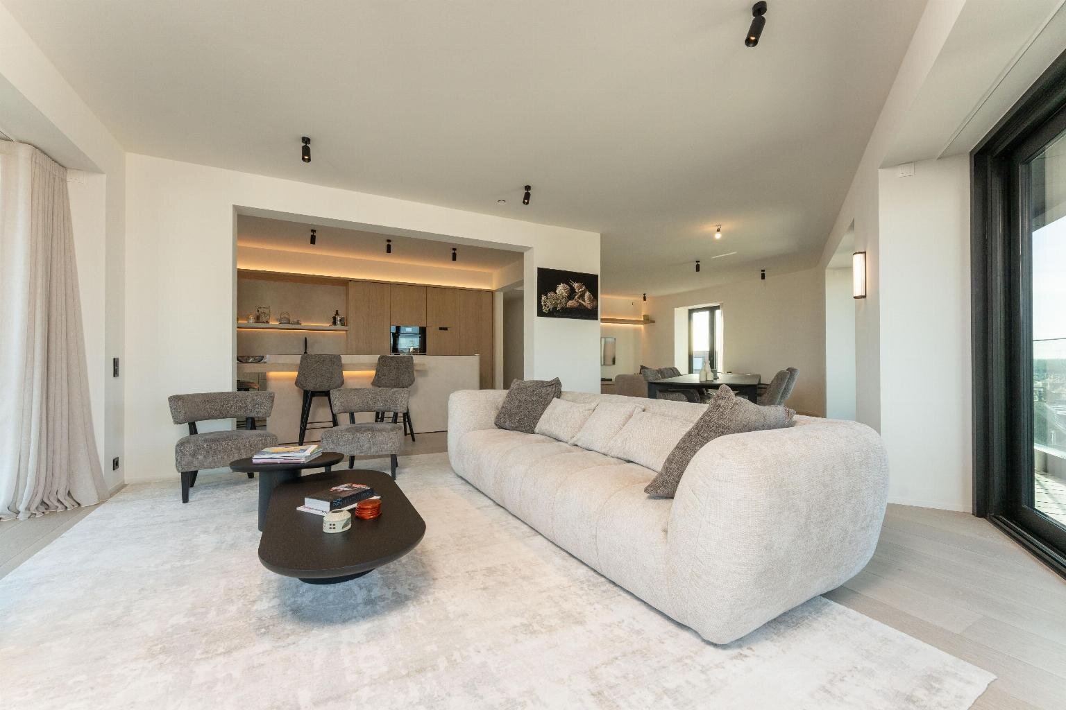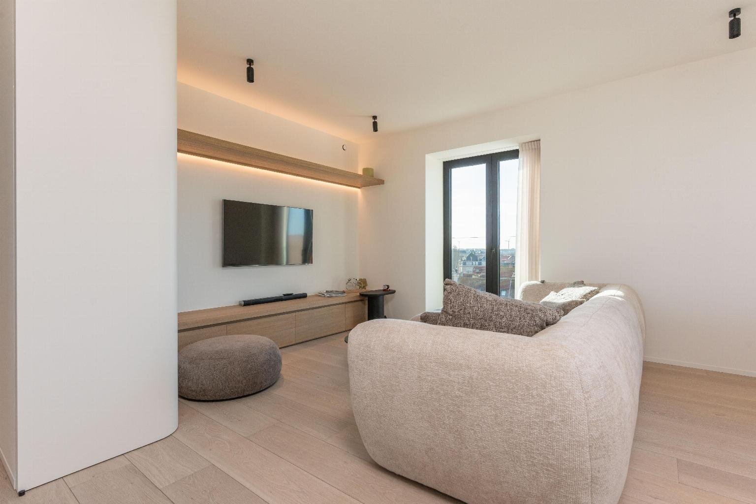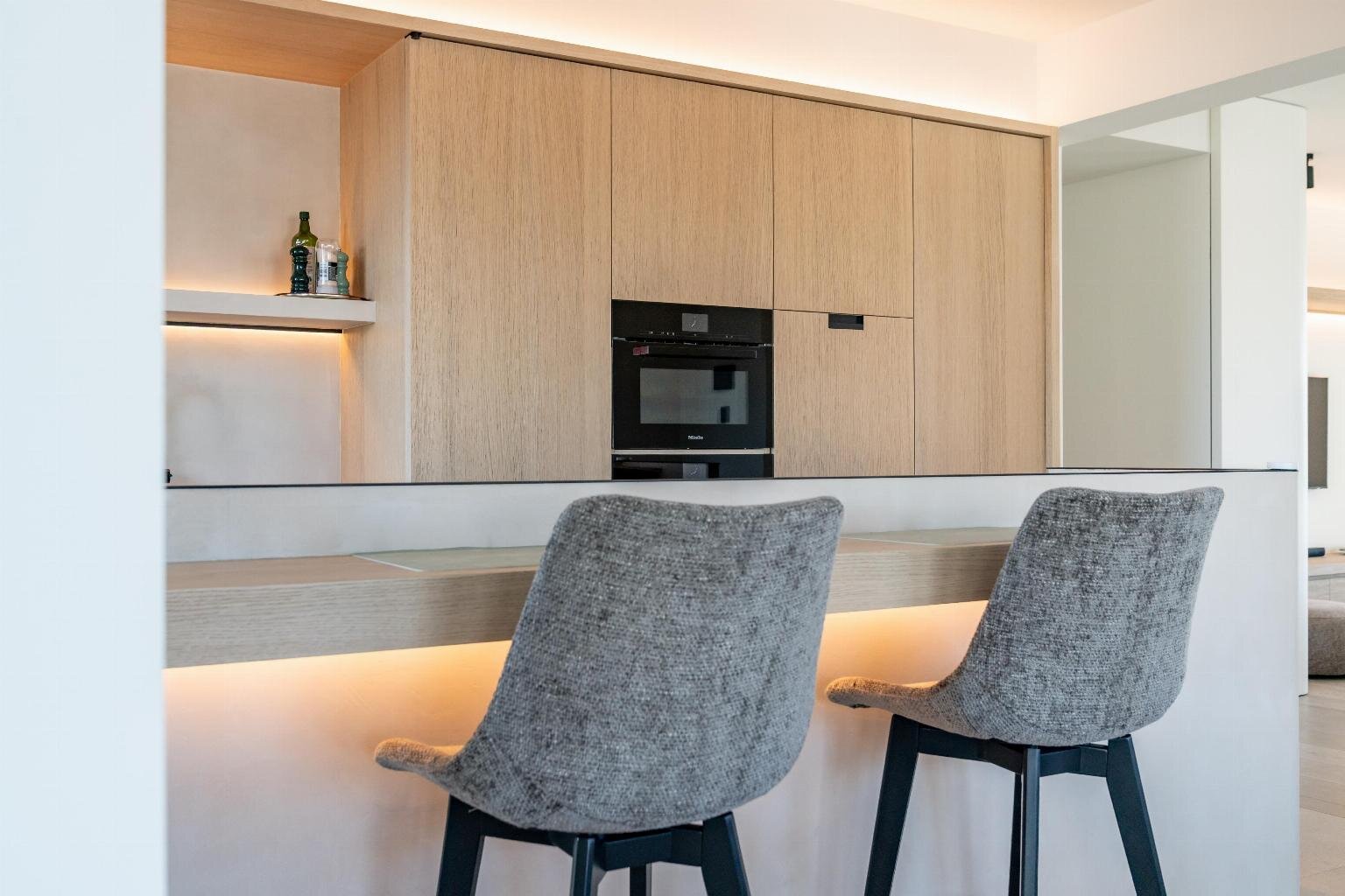De leefruimte straalt rust en elegantie uit en wordt versterkt door een warme parketvloer van Woodstoxx. De open keuken, volledig op maat gerealiseerd door Diapal, is een toonbeeld van functionaliteit en verfijning en uitgerust met onder meer subtiel geïntegreerde LED-strips onder het kookeiland, een verhoogde vaatwasser en een innovatieve cooker-kraan. De maatwerkkasten, uitgevoerd door Decolust, sluiten naadloos aan bij het architecturale geheel en versterken het exclusieve karakter van het appartement.