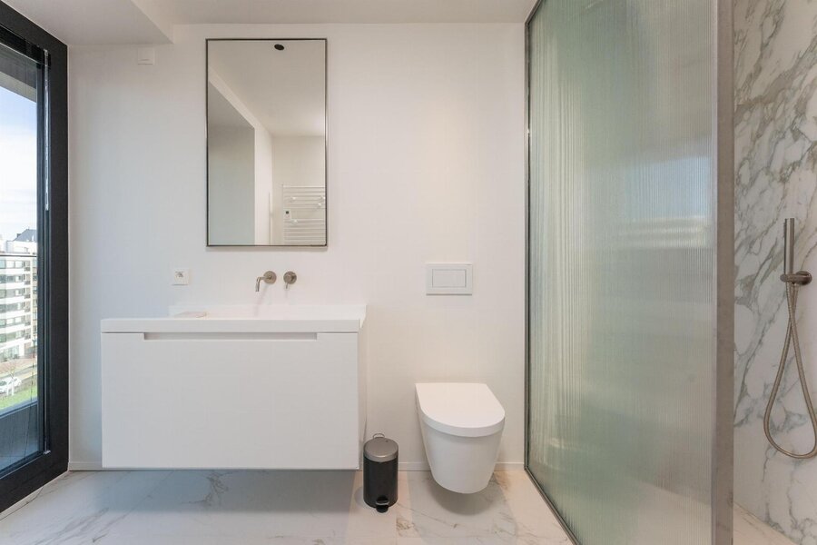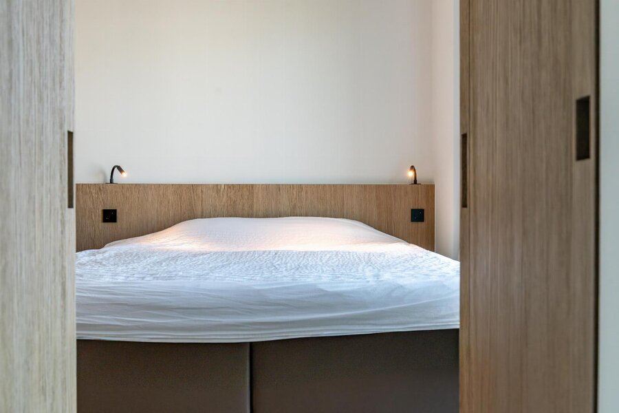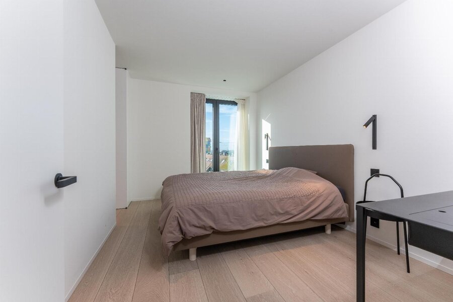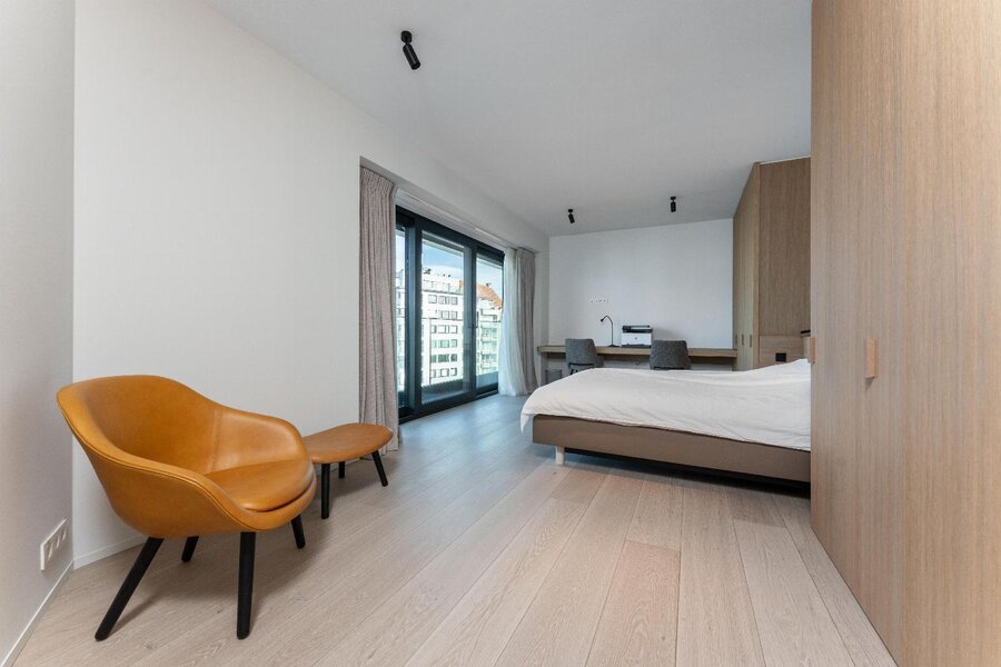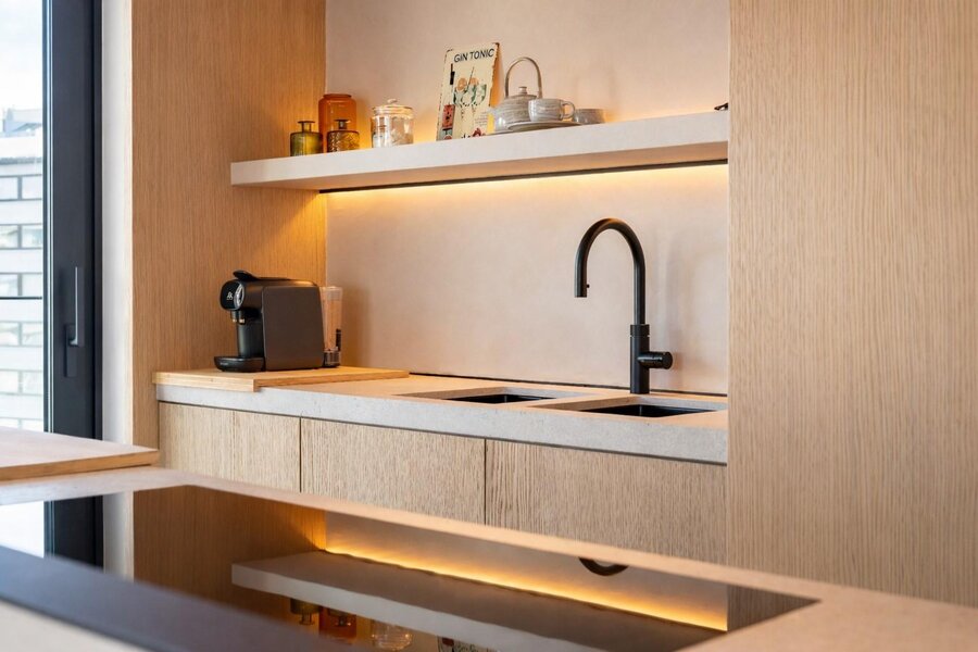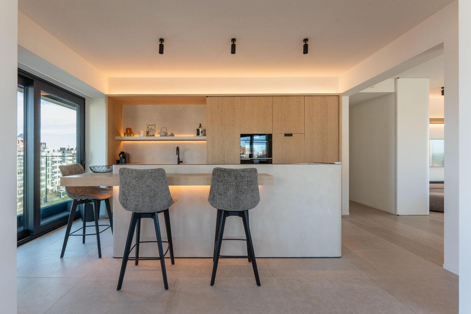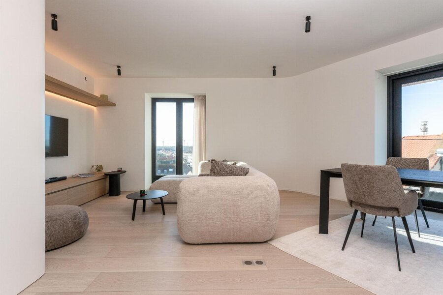 De leefruimte straalt rust en elegantie uit en wordt versterkt door een warme parketvloer van Woodstoxx. De open keuken, volledig op maat gerealiseerd door Diapal, is een toonbeeld van functionaliteit en verfijning en uitgerust met onder meer subtiel geïntegreerde LED-strips onder het kookeiland, een verhoogde vaatwasser en een innovatieve cooker-kraan. De maatwerkkasten, uitgevoerd door Decolust, sluiten naadloos aan bij het architecturale geheel en versterken het exclusieve karakter van het appartement.