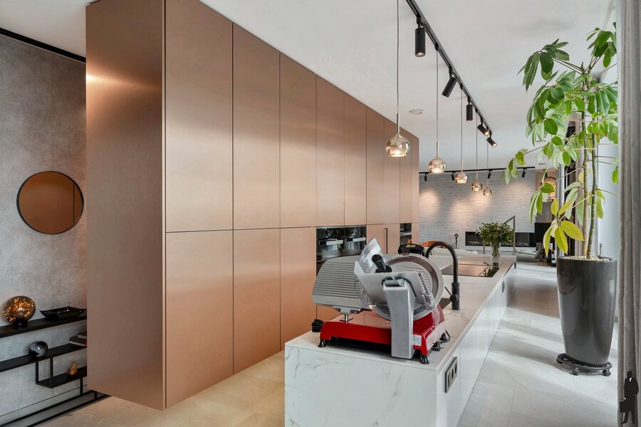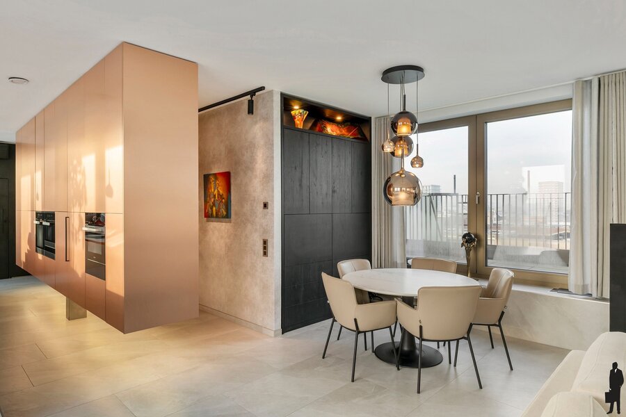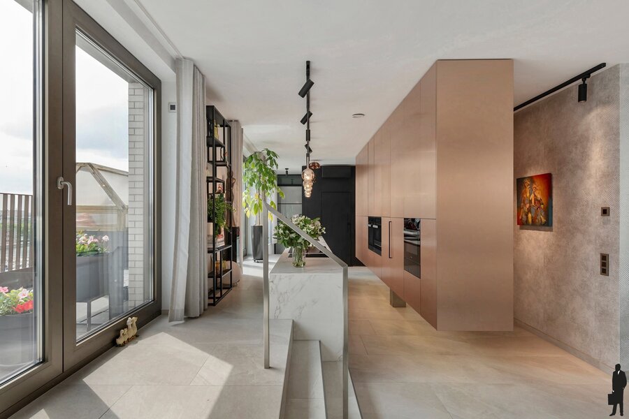 Deze uitzonderlijke penthouse bevindt zich op een toplocatie in Antwerpen, waar comfort, technologie en design naadloos samenkomen. Gelegen op de Binnenvaartstraat 33, biedt deze woonparel een verfijnde leefomgeving met hoogwaardige materialen, slimme technologieën en twee riante terrassen met een ideale oriëntatie op het oosten, zuiden en westen. Bij het betreden van de penthouse valt meteen de open leefkeuken op, uitgerust met absolute topapparatuur van MIELE – waaronder een heteluchtoven, stoomoven, combi-stoomoven, warmhoudlades, wijnkoeler en een inductiekookplaat met downdraft afzuiging. Deze keuken is zonder twijfel een grote troef voor culinaire liefhebbers.