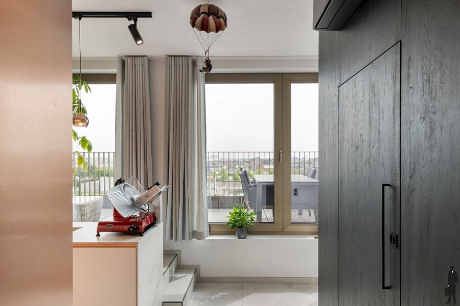 De lichtrijke leefruimte is voorzien van royale raampartijen, een sfeervolle gashaard, ingemaakte kasten en elektrische screens, volledig bedienbaar via een geavanceerd domoticasysteem dat ook de verlichting aanstuurt. Het appartement beschikt bovendien over comfortabele vloerverwarming, wat bijdraagt aan het luxueuze woongevoel. Elke slaapkamer is uitgerust met maatwerk kasten en een stijlvolle badkamer, wat de penthouse ideaal maakt voor wie op zoek is naar privacy en comfort in een exclusieve setting.