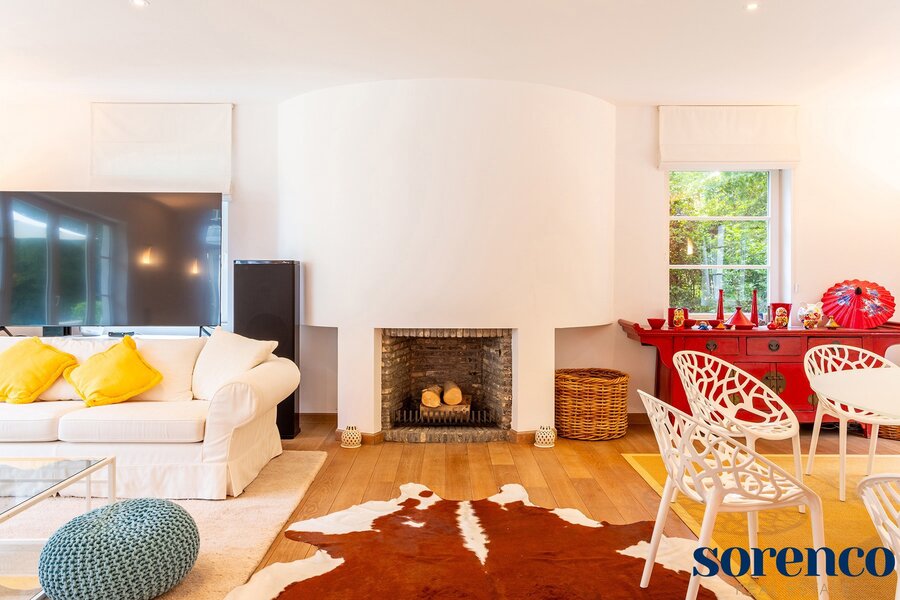 Bij binnenkomst via de INKOMHAL treft u een apart gastentoilet met handenwasser en een vestiaire. Een dubbele glazen deur biedt toegang tot de riante en lichte WOONKAMER met een majestueus raam dat doorloopt tot de verdieping. De leefruimte, opgesplitst in een zithoek, salon en eetkamer, is voorzien van een eiken parketvloer en een open haard, en biedt een wijds uitzicht op de tuin en het zwembad. U wordt direct gecharmeerd door het vakantiegevoel dat deze villa uitstraalt, waarbij de ruimtes mooi in elkaar vloeien.