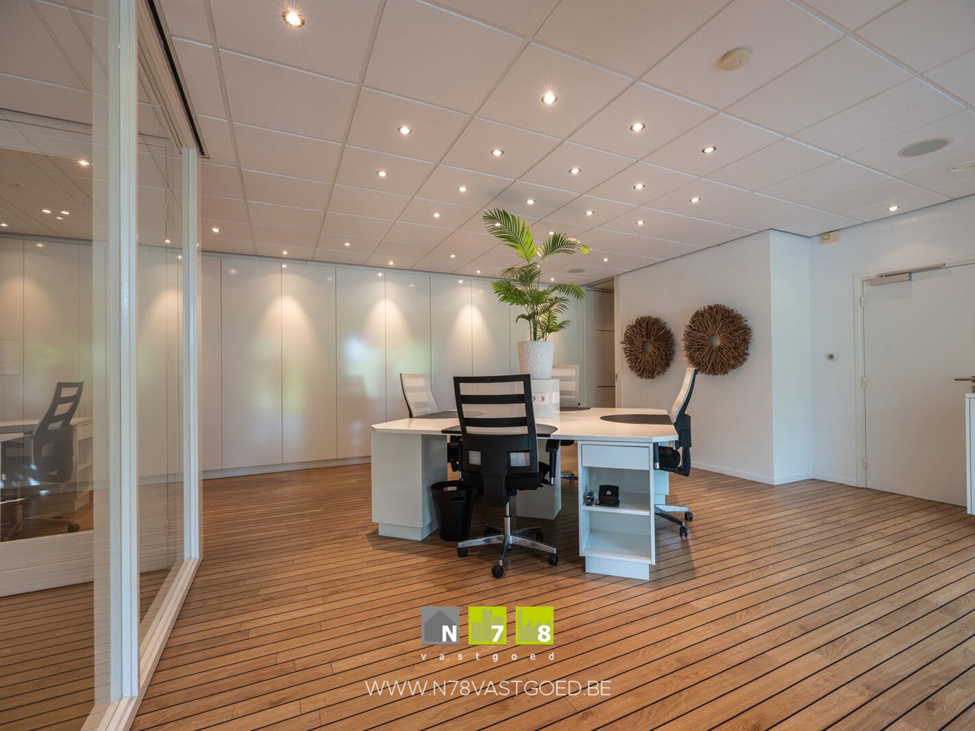 - Kantoor/polyvalente ruimte (6,00m x 7,00m = 42,00m²): aparte zij-ingang, inkomhal, inbouwkasten, ingebouwde luidsprekers, dimbare inbouwspots, alarminstallatie, PVC-vloer (teak look).