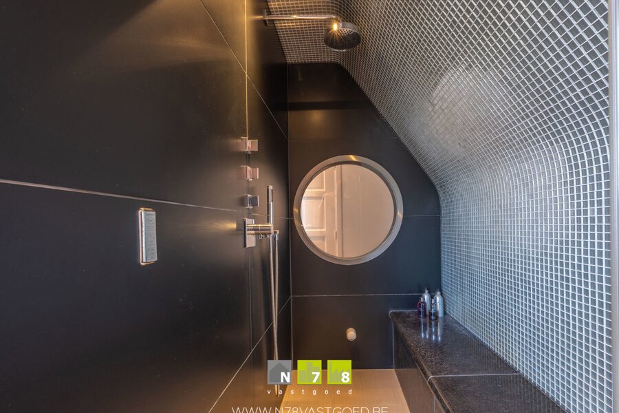 - Badkamer 1 (3,80m x 4,30m = 16,34m²): ligbad, badkamermeubel (dubbele lavabo, lades), (regen)douche/stoomcabine, hangtoilet, toegang tot balkon, TV-aansluiting, dimbare spots, vloerverwarming, tegelvloer.