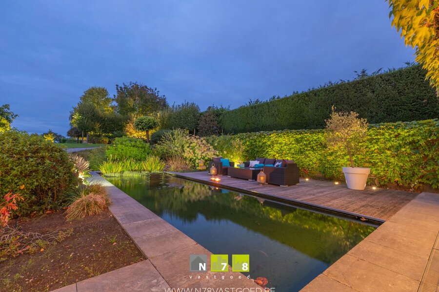 - Buitenruimte met vijverpartij, terrassen, tuinhuis en automatische toegangspoort, volledig voorzien van beregeningssysteem.