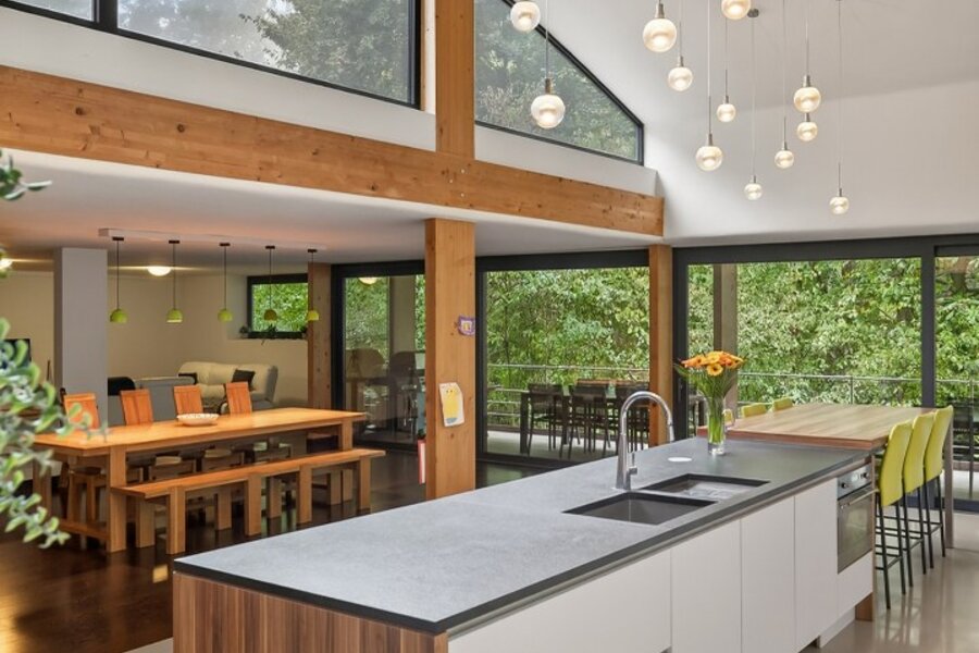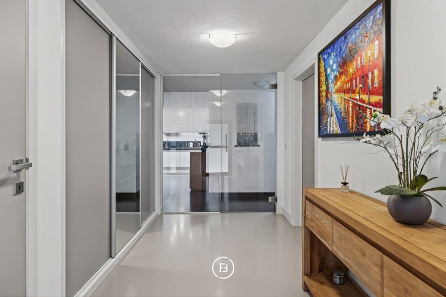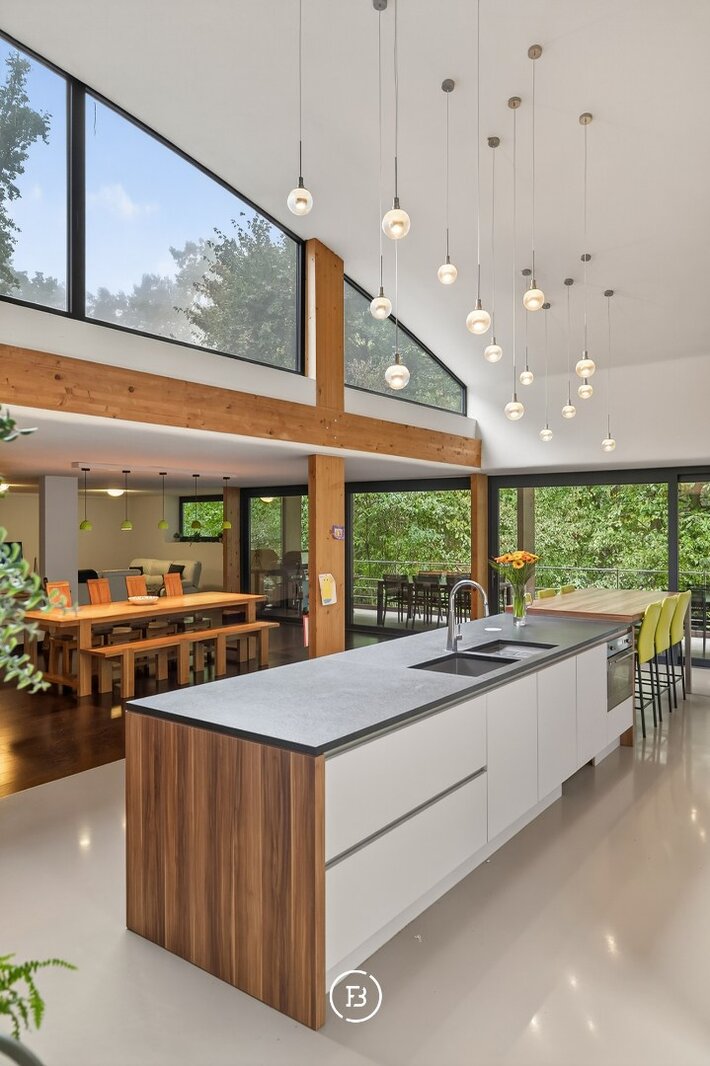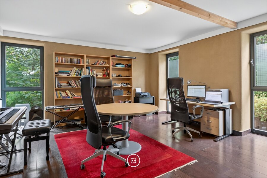 Au rez-de-chaussée se trouve un hall d'entrée spacieux avec vestiaire et toilettes, ainsi qu'un espace bureau idéal pour le télétravail. L'espace de vie lumineux comprend une cuisine ouverte, une salle à manger et un coin salon, qui forment ensemble un ensemble harmonieux. Adjacente à la cuisine se trouve une pièce ouverte, parfaite pour servir de coin jeux ou de deuxième bureau.