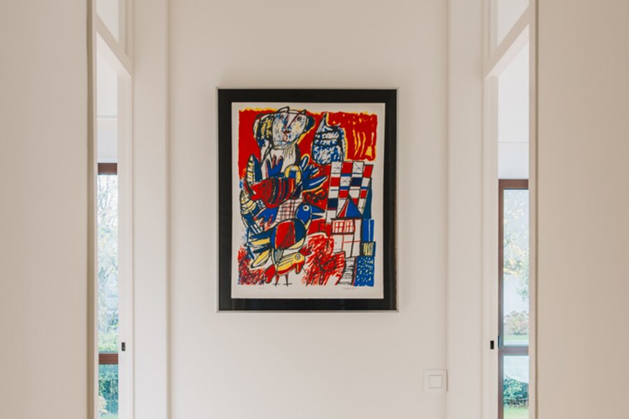 Hall d’entrée avec placards intégrés et toilettes pour invités. Quelques marches mènent à l’espace bureau avec salle de réception et grande salle de dessin avec terrasse – l’ancien cabinet de l’architecte. De là, vue sur le séjour – un espace parfait pour travailler ou se détendre !