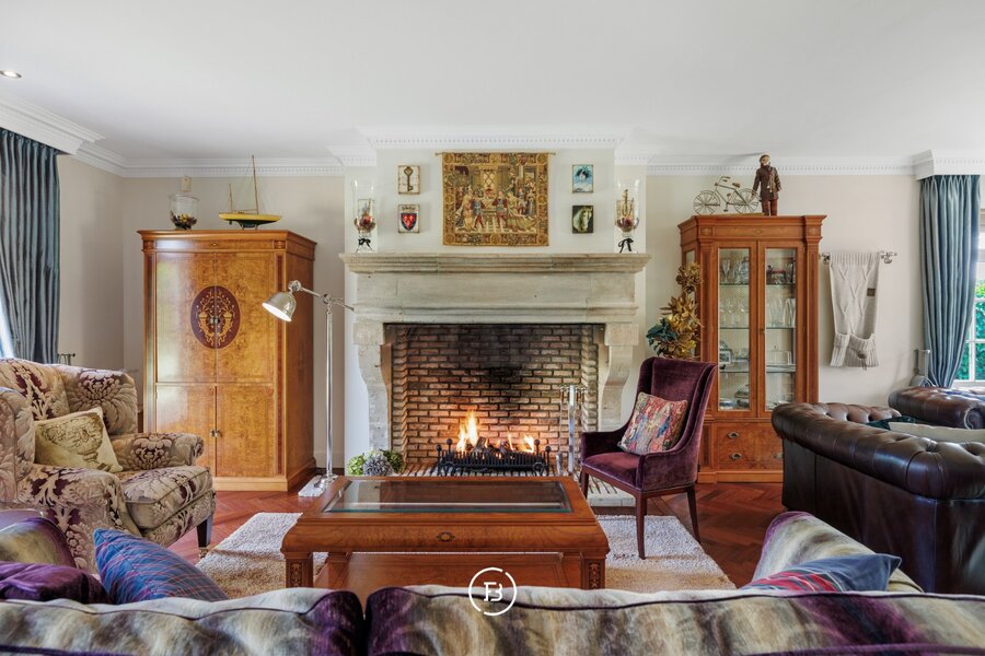 Le salon est doté d'une cheminée chaleureuse, qui est le cœur de cette maison confortable. À côté se trouve la cuisine avec un îlot et un débarras pratique. Le rez-de-chaussée comprend également des toilettes pour les invités et l'accès à une cave spacieuse.