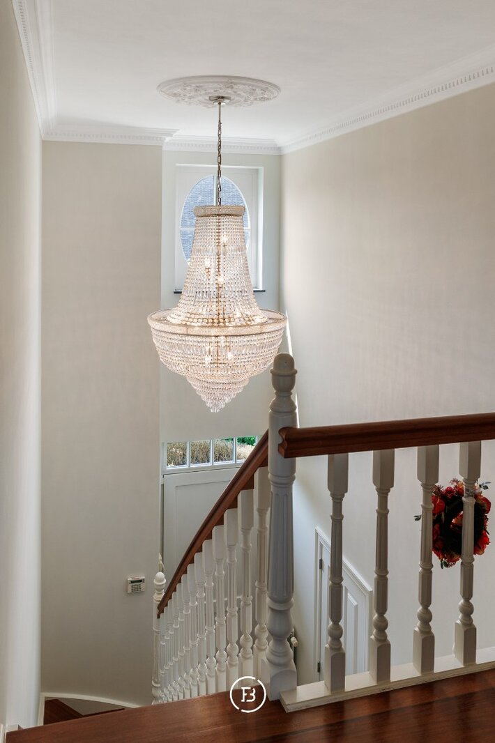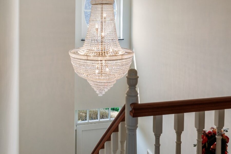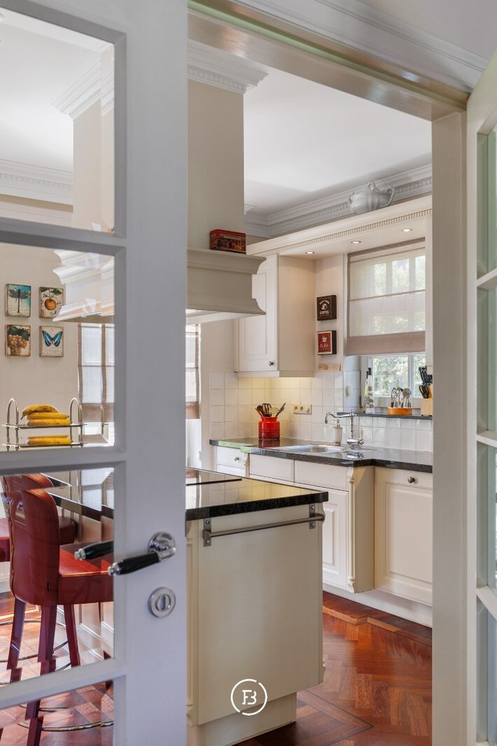 En entrant dans la maison, vous remarquerez immédiatement le parquet élégant qui se déploie en motif à chevrons sur tout le rez-de-chaussée, y compris dans la cuisine.