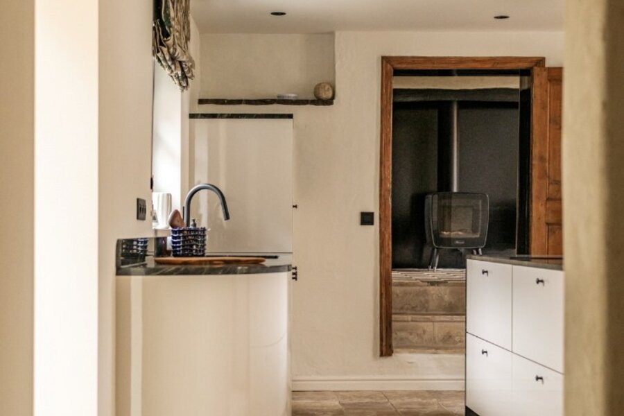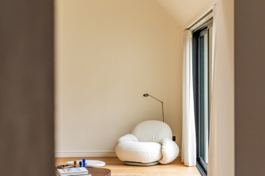 Un atout supplémentaire à ce niveau : une pièce en mezzanine avec poêle, pleine de charme, idéale comme bureau, espace de loisirs ou coin lecture cosy. La salle de bains moderne est équipée d’une douche à l’italienne et d’un lavabo.