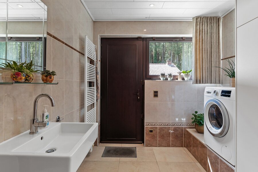 Het slaapgedeelte omvat vijf slaapkamers: drie op het gelijkvloers, waaronder de masterbedroom met grote ramen en ingebouwde kasten, en twee extra kamers op de verdieping. Hier vind je ook 2 handige bergzolders. De badkamer naast de master is stijlvol uitgerust met lavabomeubel, douche en ligbad.