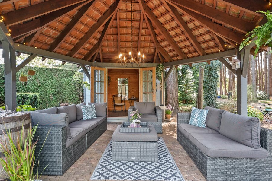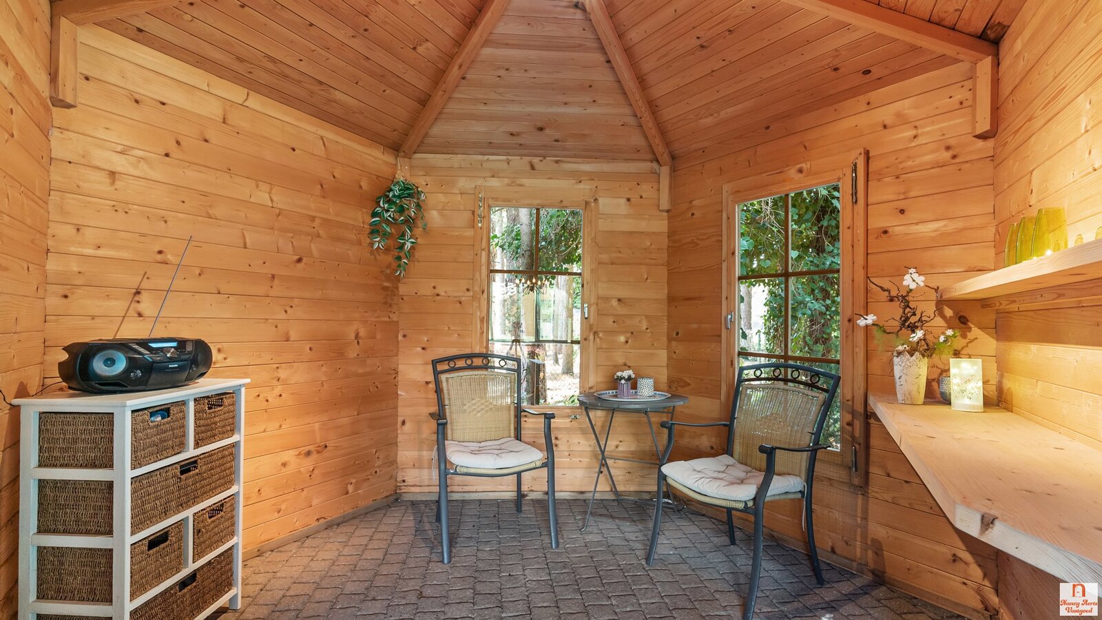 Buiten is het genieten van de prachtig aangelegde tuin, waar het overdekte zwembad in een veranda-constructie het absolute pronkstuk vormt. Met een eigen keukenhoek, douche, toilet, kleedkamer en sauna is dit een privé-wellness waar ontspanning centraal staat. Verder is er een charmante pergola met tuinhuis, nu ingericht als zitruimte, waardoor je ook op frissere dagen kunt genieten van het buitenleven. Een fontein en sfeervolle beplanting maken het geheel compleet.