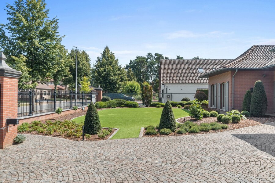 Een statige oprit met elektrische poort leidt naar de woning, waar de royale inkomhal meteen indruk maakt. De eiken trap naar de verdieping vormt een elegante eyecatcher, terwijl de logische indeling je direct toegang geeft tot alle ruimtes. Het bureel, de lichte woonkamer met open haard en schuifraam naar de tuin, de eetruimte en open keuken met zicht op het zuidwestgerichte buitenleven, de slaapkamers, de garage en de kelder zijn bereikbaar vanuit de hal. Aangrenzend aan de keuken bevindt zich een praktische berging met inbouwkasten, ruimte voor was- en droogtoestellen en een apart toilet.
