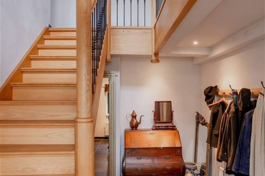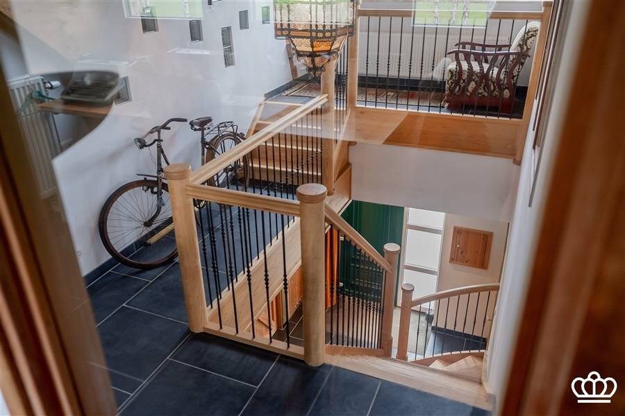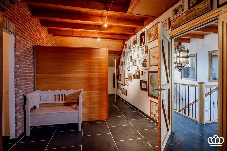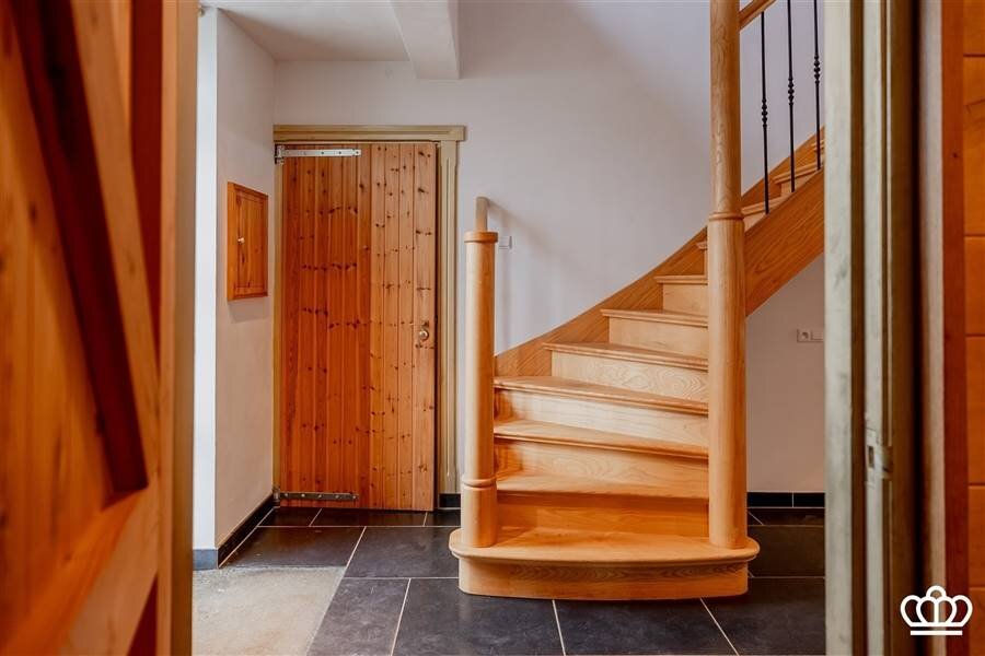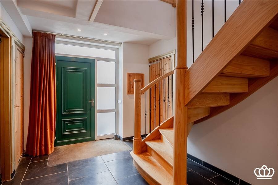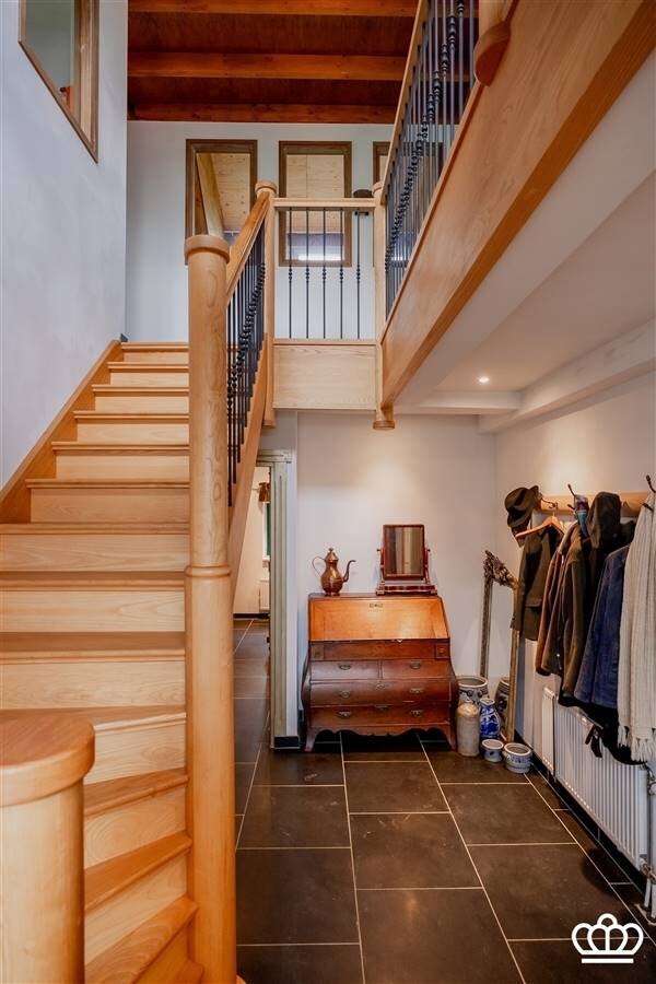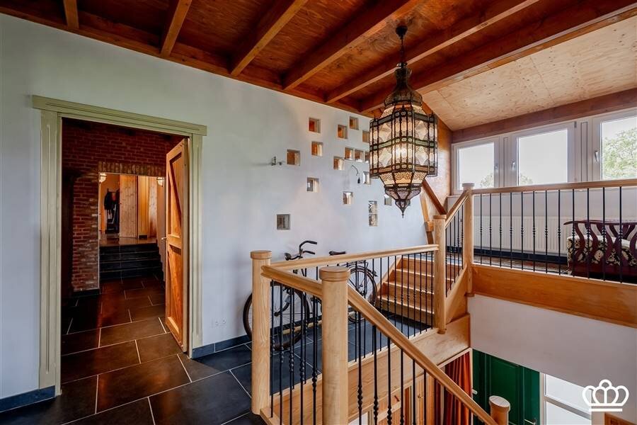 De inkomhal met de mooie houten trap als blikvanger is zeer uitnodigend en vat de warme sfeer van de woning meteen natuursteen vloeren, kwaliteitsafwerking en op elkaar afgestemde materialen door de hele woning geven het geheel een landelijke uitstraling.