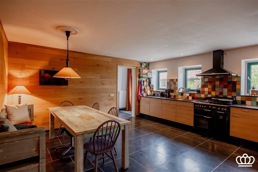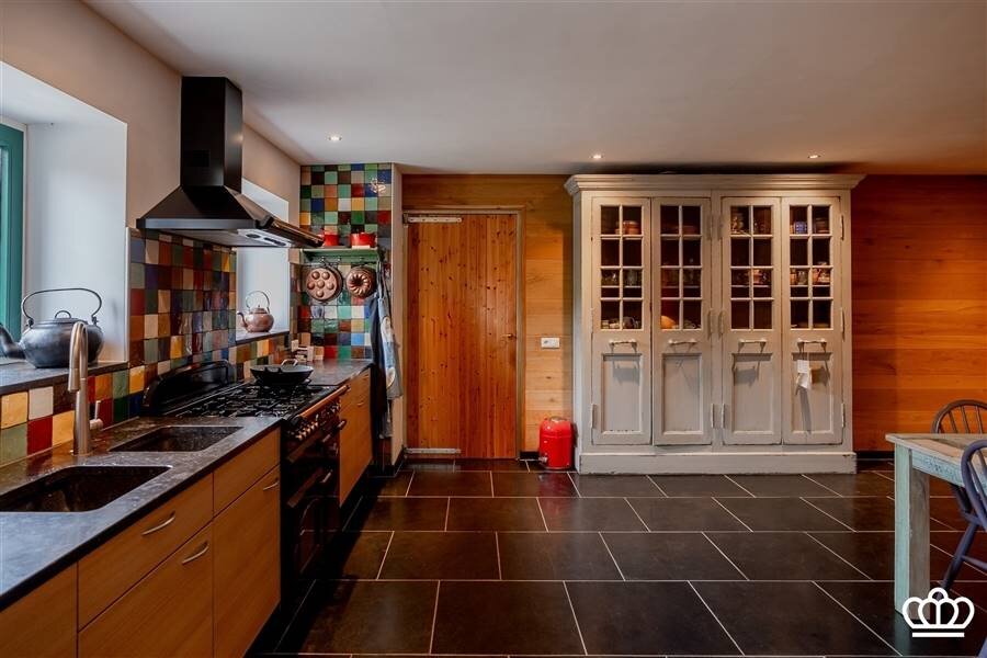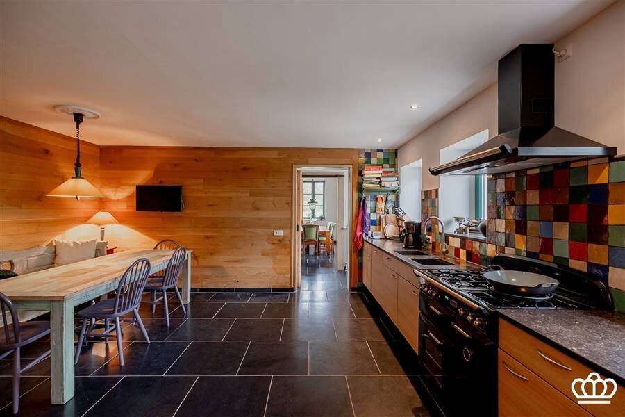 De grote landelijke leef-keuken met gezellige eethoek is uitgerust met een Falcon-fornuis (5-pits gas,2 ovens en bordenwarmer). Vanuit de keuken is de voorraadkelder toegankelijk. Praktische bijkeuken met verhoogde plaats voor wasmachine, droogkast.