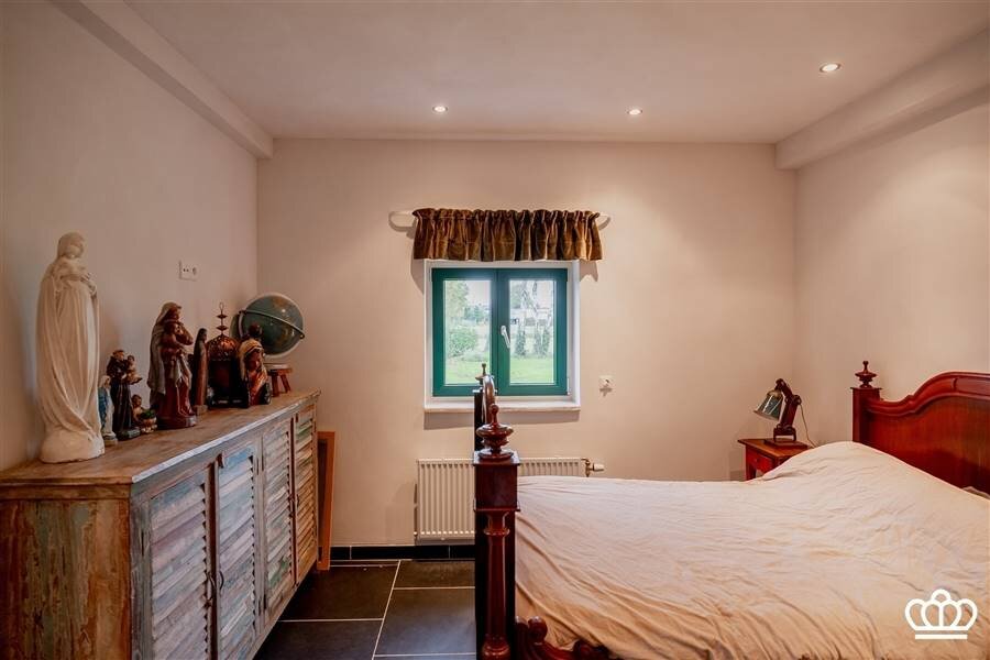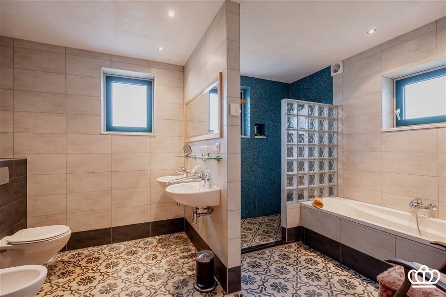 Verder is er op het gelijkvloers een masterbedroom met een grote luxe badkamer (uitgerust met ligbad, douche, wastafels, wc, bidet en authentieke vloertegels). Tevens een aparte bureelruimte.