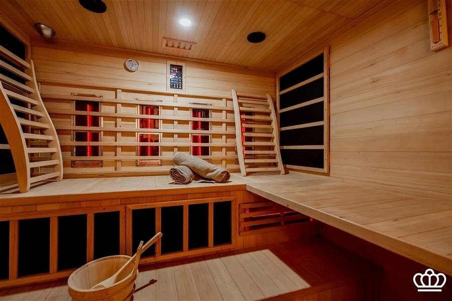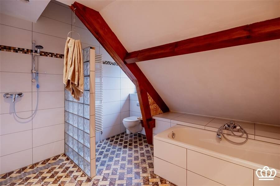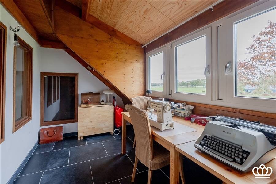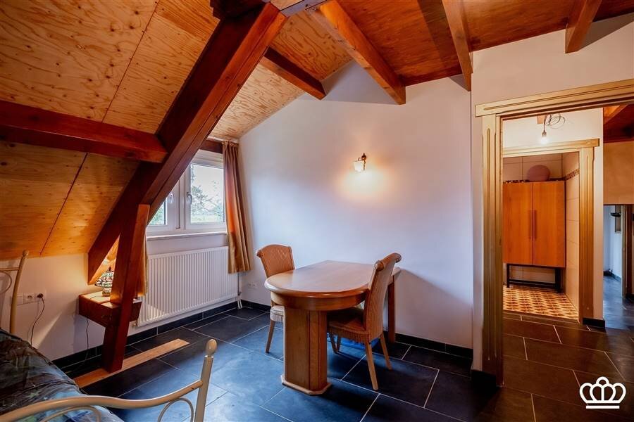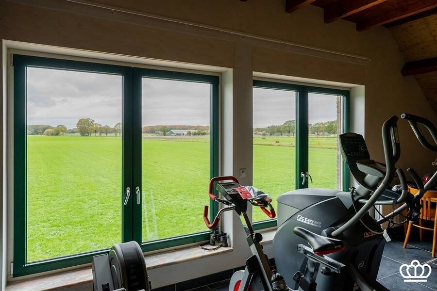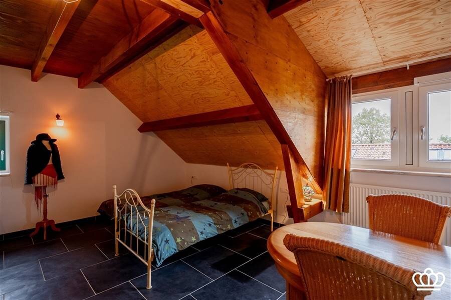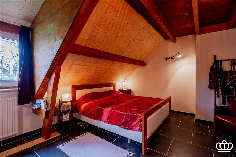 De nachthal is speels ingedeeld door de niveauverschillen. In totaal zijn hier 4 slaapkamers en 1 badkamer. 1 van de slaapkamers, momenteel ingericht als fitnessruimte, geeft door de grote ramen een waanzinnig uitzicht over de aangrenzende weilanden!!! De badkamer is goed uitgerust (bad; inloopdouche, wc, en ook hier zijn originele tegelvloeren) Verder is er een mooie wellness-hoek met een sauna (combi Finse sauna en infrarood) en een opkamer. Twee bergzolders maken het geheel compleet.