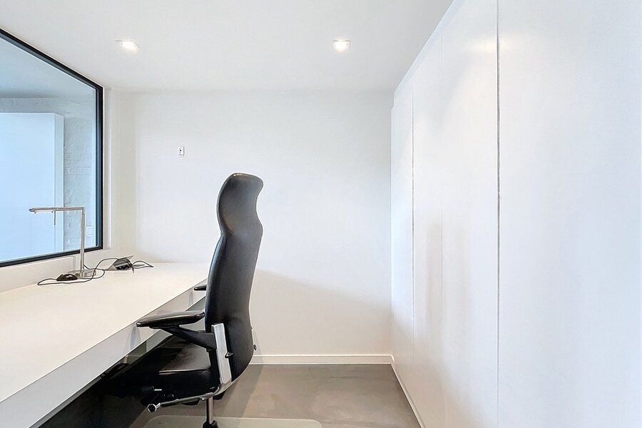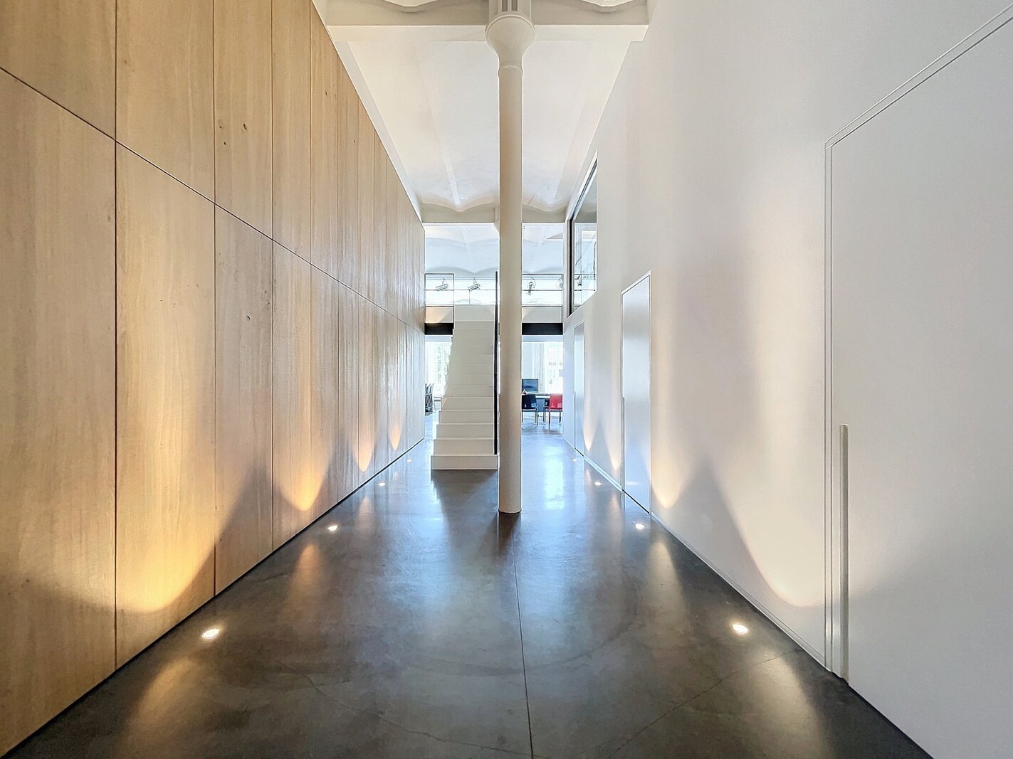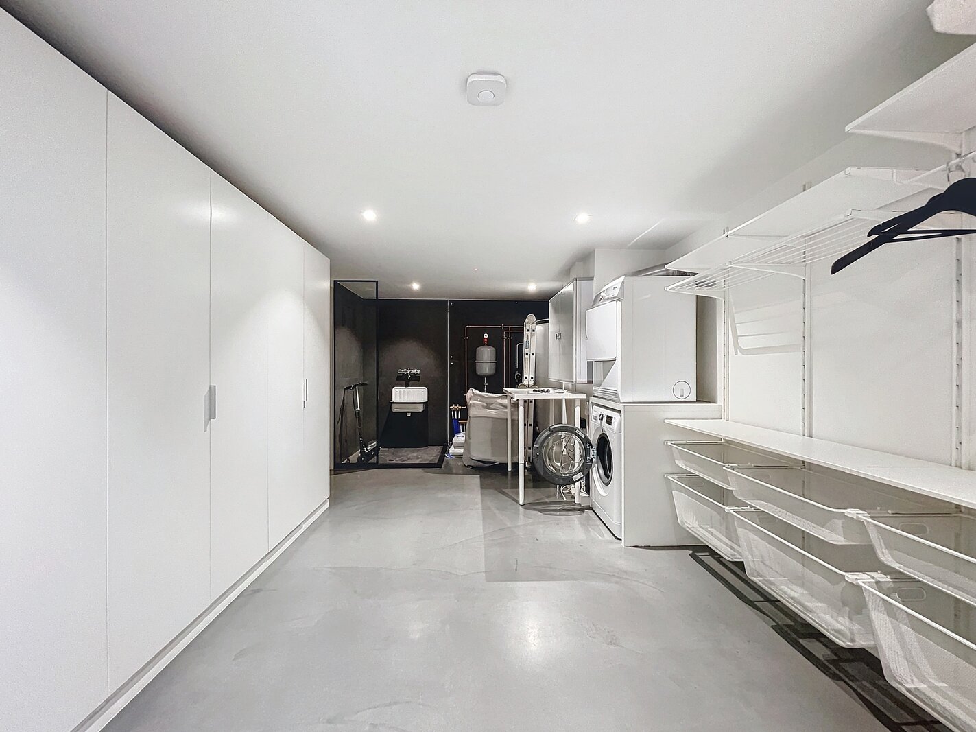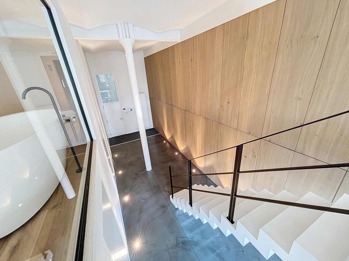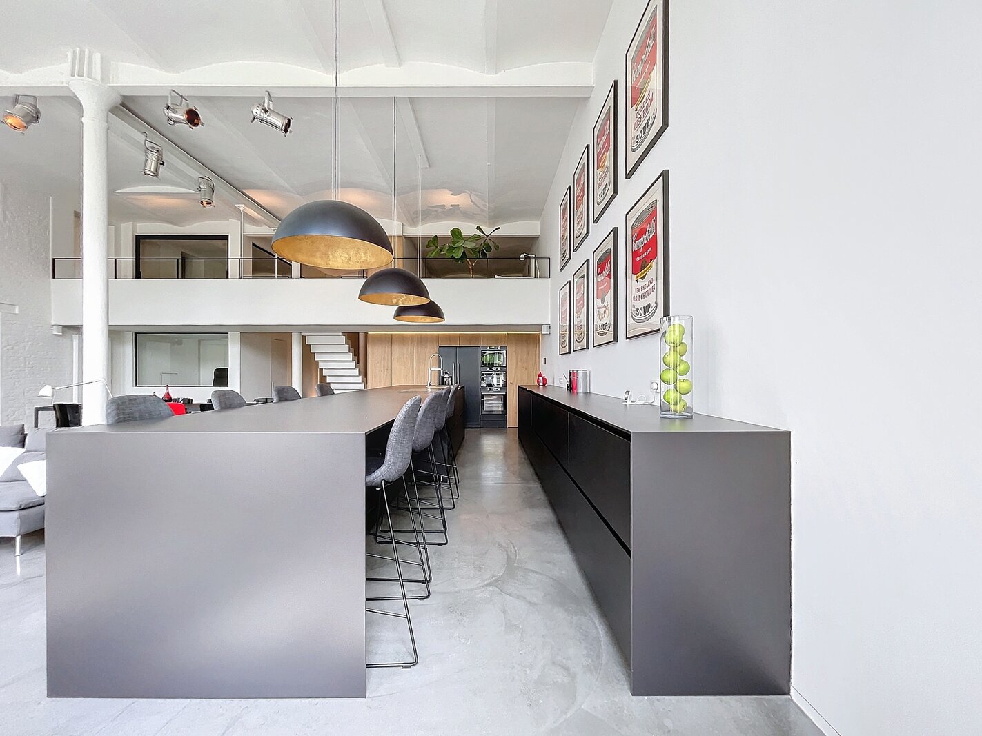 Dès l'entrée, on est immédiatement séduit par l'impressionnant hall d'entrée qui mène au vestiaire et aux toilettes pour invités, à un spacieux débarras et à un bureau équipé d'armoires encastrées. Le tout est suivi d'un espace ouvert bénéficiant d'une lumière naturelle abondante dans lequel se trouvent l'espace de vie et la cuisine ouverte. La cuisine dispose de toutes les commodités et de tous les articles ménagers, depuis le réfrigérateur américain, le four, le four à vapeur, le four à micro-ondes jusqu'à toutes sortes d'ustensiles de cuisine. L'îlot de cuisine peut accueillir 8 personnes. À côté de la cuisine et du hall d'entrée se trouve une buanderie/rangement pratique et spacieux avec des placards intégrés et un lave-vélos pour laver vos bicyclettes. En outre, cette propriété comprend une salle polyvalente qui peut être utilisée comme salle de jardin, bureau supplémentaire, espace de vie supplémentaire ou similaire. Le premier étage comprend 2 chambres à coucher, chacune avec des armoires encastrées, une pièce de rangement/un dressing supplémentaire, une luxueuse salle de bains avec double douche, baignoire, cabine infrarouge et des toilettes séparées. Ce loft bénéficie également d'une terrasse exceptionnellement spacieuse accessible depuis l'espace de vie et/ou la salle de jardin. Enfin, 2 places de parking sont disponibles dans le parking souterrain où se trouve également un local à vélos fermé à clé.