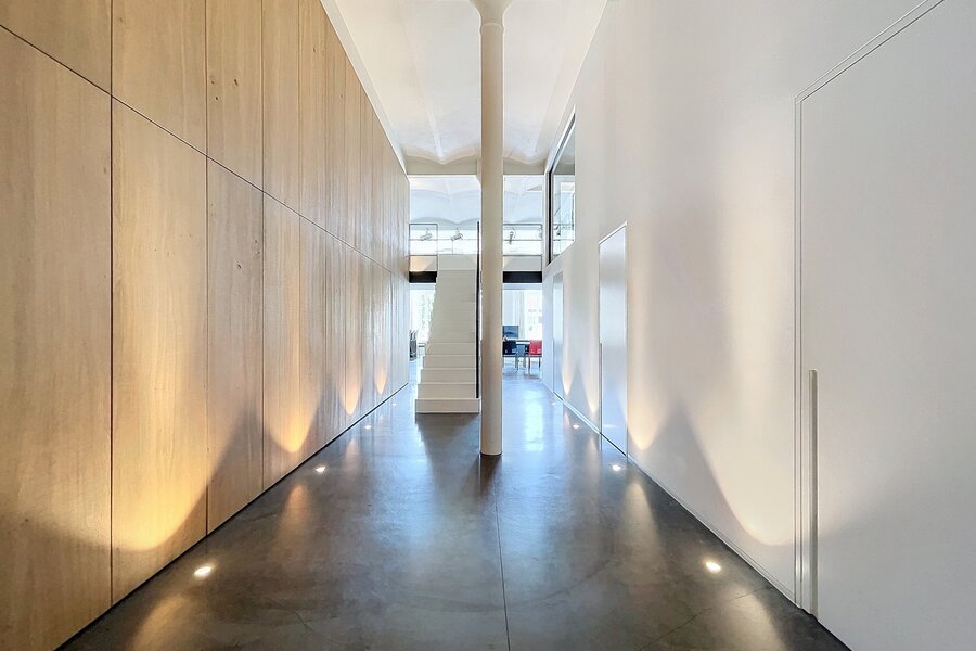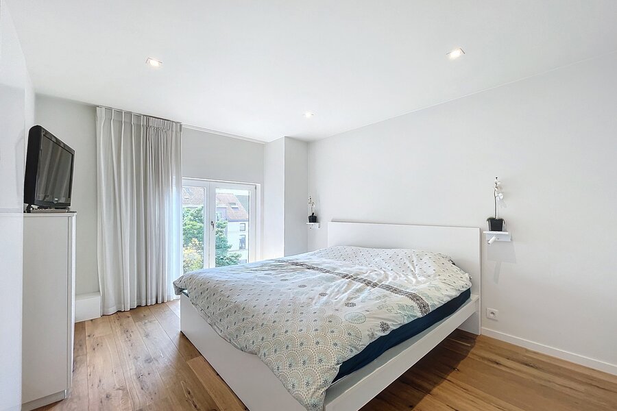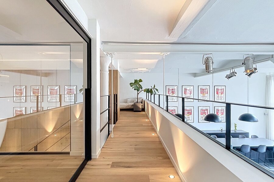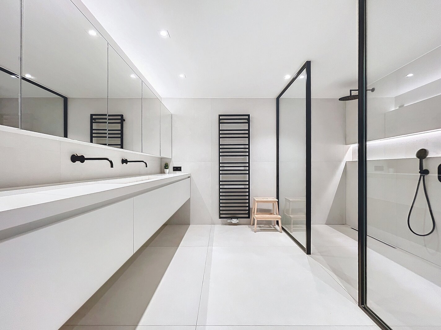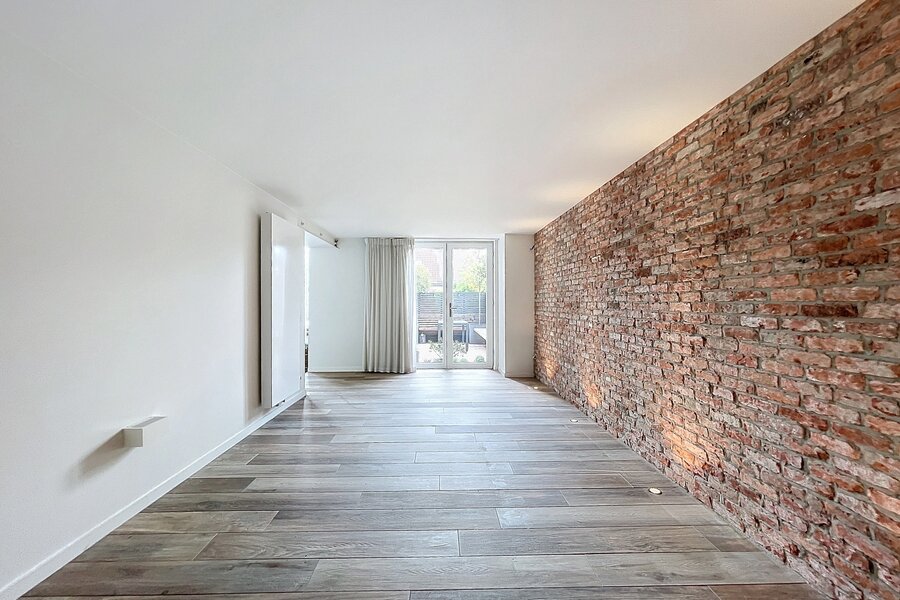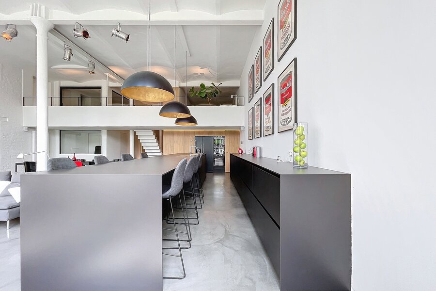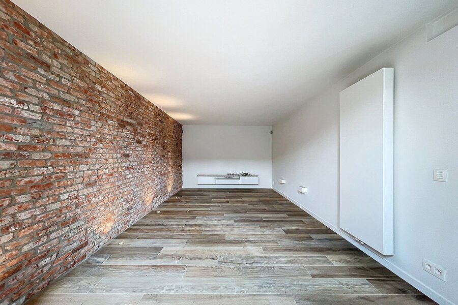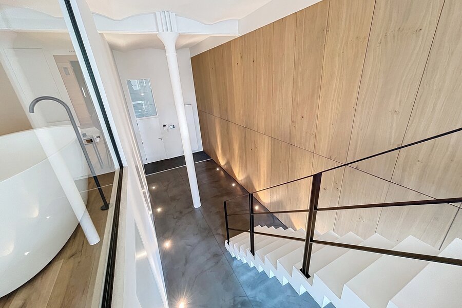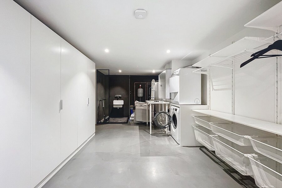 Dès l'entrée, on est immédiatement séduit par l'impressionnant hall d'entrée qui mène au vestiaire et aux toilettes pour invités, à un spacieux débarras et à un bureau équipé d'armoires encastrées. Le tout est suivi d'un espace ouvert bénéficiant d'une lumière naturelle abondante dans lequel se trouvent l'espace de vie et la cuisine ouverte. La cuisine dispose de toutes les commodités et de tous les articles ménagers, depuis le réfrigérateur américain, le four, le four à vapeur, le four à micro-ondes jusqu'à toutes sortes d'ustensiles de cuisine. L'îlot de cuisine peut accueillir 8 personnes. À côté de la cuisine et du hall d'entrée se trouve une buanderie/rangement pratique et spacieux avec des placards intégrés et un lave-vélos pour laver vos bicyclettes. En outre, cette propriété comprend une salle polyvalente qui peut être utilisée comme salle de jardin, bureau supplémentaire, espace de vie supplémentaire ou similaire. Le premier étage comprend 2 chambres à coucher, chacune avec des armoires encastrées, une pièce de rangement/un dressing supplémentaire, une luxueuse salle de bains avec double douche, baignoire, cabine infrarouge et des toilettes séparées. Ce loft bénéficie également d'une terrasse exceptionnellement spacieuse accessible depuis l'espace de vie et/ou la salle de jardin. Enfin, 2 places de parking sont disponibles dans le parking souterrain où se trouve également un local à vélos fermé à clé.